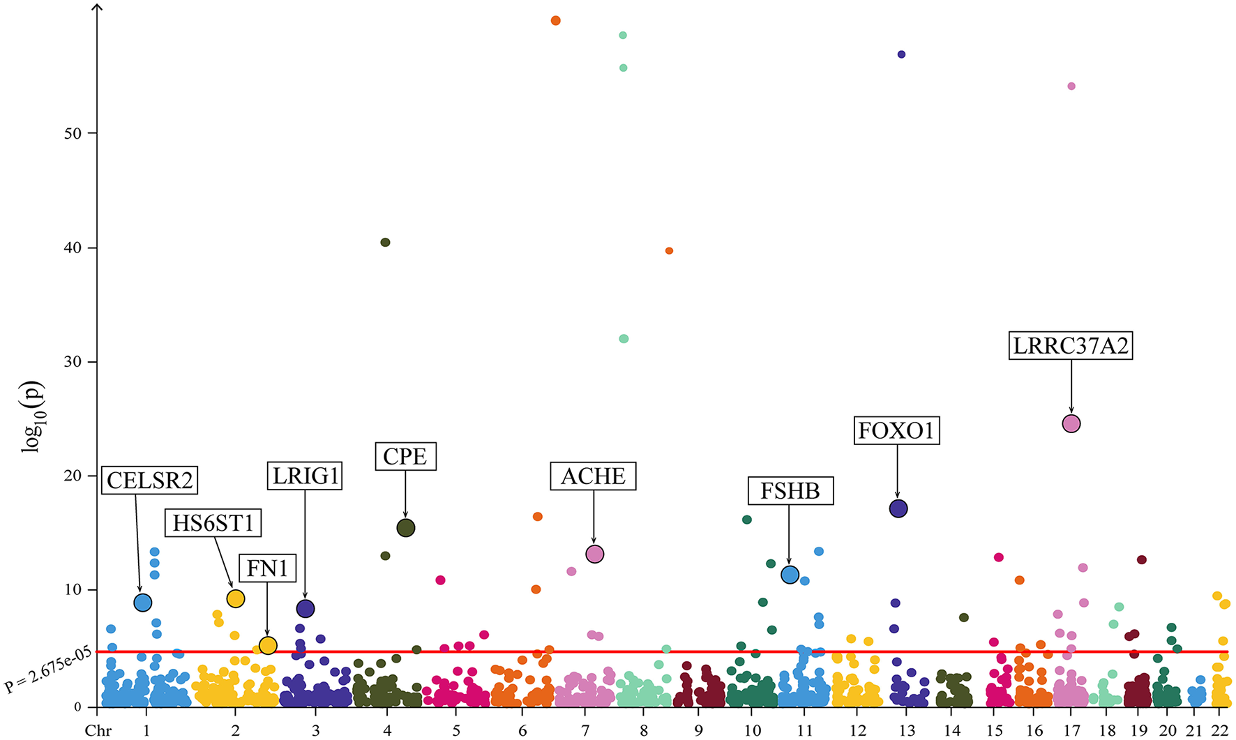 The Manhattan plot illustrating the associations between plasma proteins and HBMD. The X-axis represents chromosomal position; the Y-axis represents negative log10-transformed p-values; nine proteins demonstrating strong colocalization evidence are highlighted.