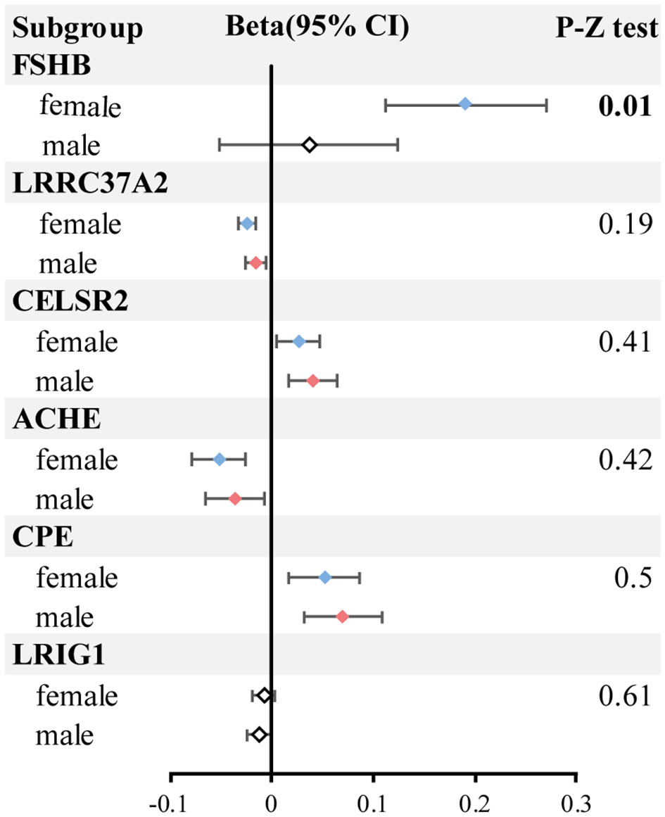 In subgroup analysis, HS6ST1 was not retrievable from the three types of outcome summary data (both-sexes, female and male HBMD). Two proteins (FN1 and FOXO1) were removed after harmonization between exposure and outcome due to ambiguous alleles. The remaining six proteins (ACHE, CELSR2, CPE, FSHB, LRIG1, LRRC37A2) consistently demonstrated causal effects on HBMD for both sexes, aligning with the previous results. However, LRIG1 did not have a causal effect on female HBMD (P = 0.167), while FSHB (P = 0.404) and LRIG1 (P = 0.051) were not associated with male HBMD. Bilateral Z-test results indicated that only FSHB had a significantly more positive effect on female HBMD (beta = 0.20; 95% CI = 0.11–0.23) compared to male HBMD (beta = 0.04; 95% CI = −0.05 to 0.08; z-test P-value = 0.011; Figure 3; Supplementary Table 8).