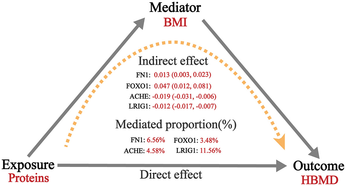 MR analysis exploring mediation effects revealed that the causal relationships between four proteins and BMD were partially mediated by BMI. In the first step, ACHE (beta = −0.019; 95% CI = −0.031 to −0.006) and LRIG1 (beta = −0.012; 95% CI = −0.017 to −0.007) were negatively associated with BMI, whereas FN1 (beta = 0.013; 95% CI = 0.003–0.023) and FOXO1 (beta = 0.047; 95% CI = 0.012–0.081) were positively associated with BMI. In the second step, BMI was shown to be positive with HBMD (beta = 0.11; 95% CI = 0.08–0.14). Therefore, the indirect effect of ACHE, LRIG1, FN1 and FOXO1 on HBMD via BMI were 4.58% (beta = −0.002; 95% CI = −0.004 to −0.007), 11.56% (beta = −0.001; 95% CI = −0.002 to −0.007), 6.56% (beta = 0.0014; 95% CI = 0.0003–0.003) and 3.48% (beta = 0.005; 95% CI = 0.0012–0.0093), respectively (Figure 4; Supplementary Table 9).