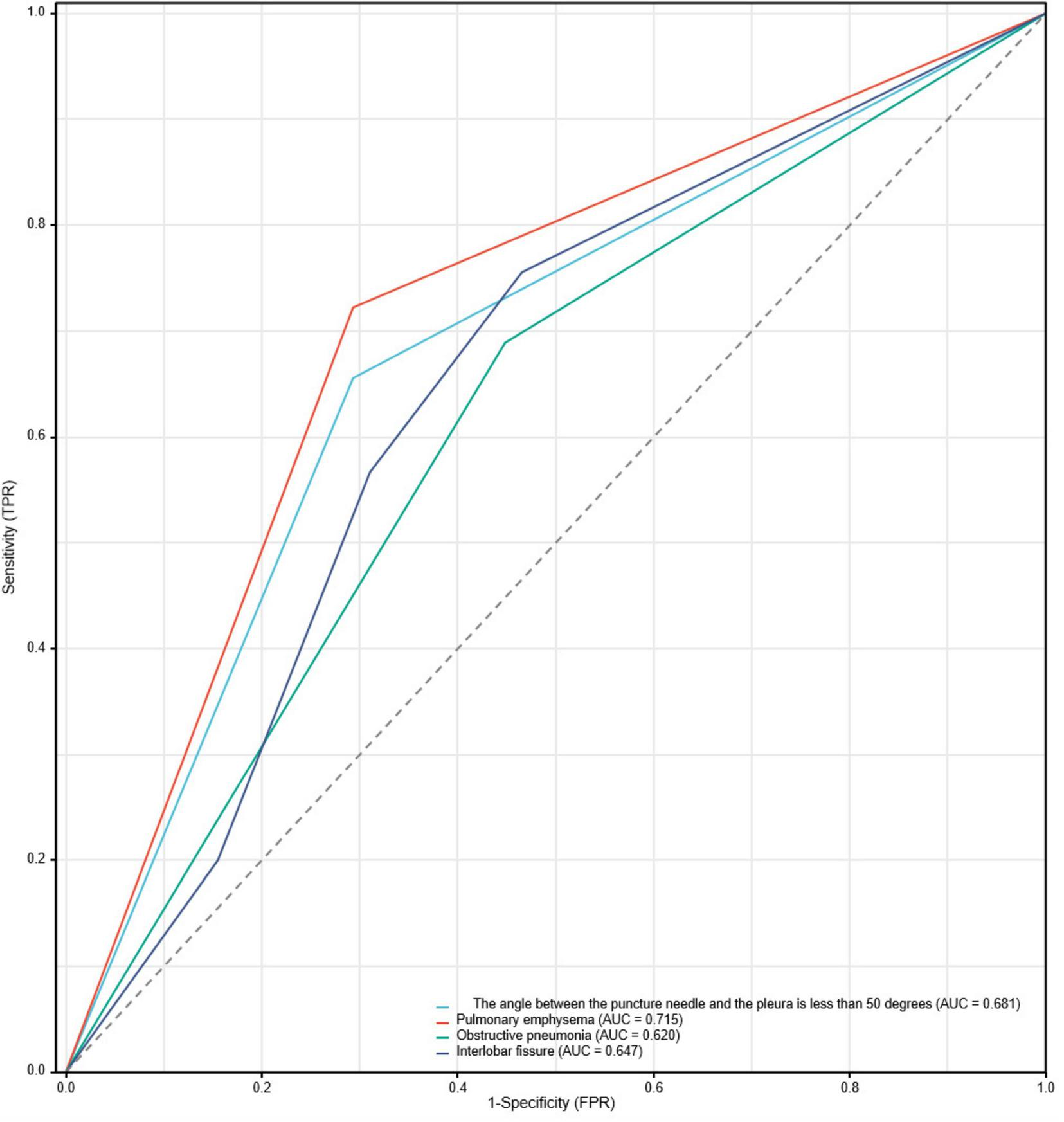 The differences between the non-pneumothorax group and pneumothorax group in terms of the angle between the puncture needle and the pleura being < 50°, preoperative CT findings indicating pulmonary emphysema, obstructive pneumonia, lung collapse, superior vena cava obstruction, and location within the interlobar fissures were statistically significant (all P < 0.05), as shown in Table 2. However, there were no statistically significant differences in the number of tumors, preoperative long diameter, lung lobe, and lung segment aspects (all P > 0.05).
