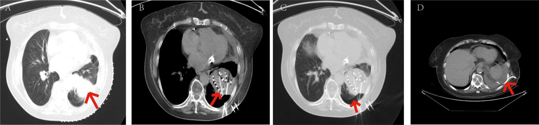 Symptoms relieved in patients with moderate pneumothorax through closed chest tube drainage. The patient, an elderly male, diagnosed with adenocarcinoma of the left lower lobe of the lung. Under our department’s care, underwent percutaneous 125I particle implantation close-range radiotherapy. (Indicated by the red arrow) (a) preoperative CT lung window showing a lesion measuring 7.3 × 4.9 cm. (b) Intraoperative mediastinal window showing the implantation of 109 particles in the lesion of the left lower lobe. (c) Intraoperative CT lung window showing the formation of moderate pneumothorax. (d) Postoperative closed chest tube drainage placement and drainage procedure, with approximately 1000 ml of gas drained over 3 days, leading to significant improvement in symptoms. On the 4th day, the closed chest tube drainage was removed, with a small amount of pleural effusion in the left lower lobe.