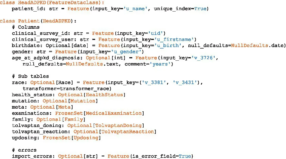 As in our example, ClinicalSurveys was used to house and collect the data from various collaborators, we used Dockers surrounding our database and Meda tool to simplify the setting up and destruction of the database. Simply put, the PostgreSQL database is fully refreshed upon each update that is being made. This ensured that only one true data source was available and reduced the need for verification of data entries within our database. To manage the automated setting up and destruction of the database Jenkins was used. The Jenkins Butler (8) monitors changes in the source code, scripts, and classes that are required and updates the database as soon as changes are observed. The total workflow using this approach takes less than 3 min and can therefore be performed as often as daily if new data are expected on a regular basis. The aforementioned classes need to be implemented to ensure that the right data is entered into the database. A simple Patient centric import of individual characteristics is shown in Code Section 1. The utilized Feature keyword here is an included separate class which provides the information on how to construct a dataclass from a data dictionary and how to import it into the SQL table. It enables the use of transformers, specifications of the input key, specifications of target table type (error, crossectional, or longitudinal), and the potential defaults to consider.