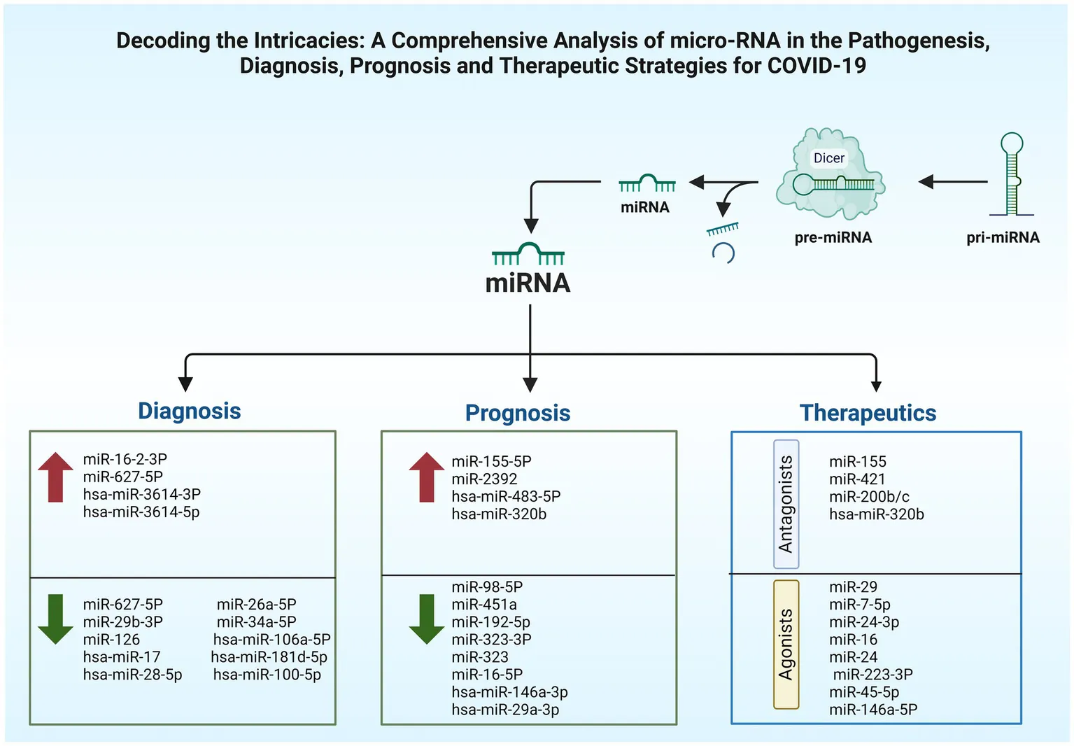 To recap, this comprehensive analysis clarifies the intricate role of miRNAs in the pathogenesis, diagnostic frameworks, prognostic assessments, and therapeutic interventions in relation to COVID-19, underscoring their significance as regulators in the interplay between host and virus, influencing immune responses, inflammatory processes, along with viral replication. Moreover, miRNAs act as potent regulatory molecules of gene expression, exerting control by attaching to compatible interaction sites. Many clinical targets for COVID-19 are miRNAs, proposing that the virus might manage its entry into cells and disrupt bodily functions by altering these regulatory miRNAs. Both host-and virus-derived miRNAs play a critical role in helping the virus to evade immune system’s components, triggering inflammatory responses, leading to overproduction of cytokines, and tissue damage. Shifts in miRNAs’ concentration may potentially mark variable stages of COVID-19 illness. Furthermore, it was discovered that miRNAs performed better in terms of diagnosis than frequently used assays. Despite showing the impact that the host-and viral-encoded miRNAs have on the development of COVID-19 in several investigations, but the actual practical usage of such findings regarding the treatment and prevention are still in the early developmental stages.
