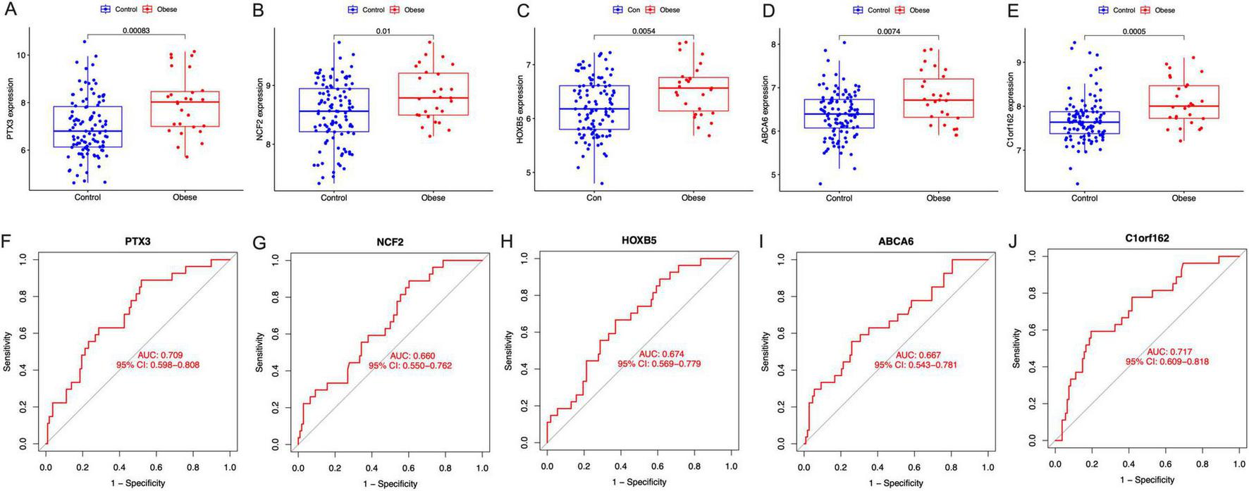 The expression and the diagnostic performance of the signature genes between normal BMI (Control) and obese mothers. (A) The expression of PTX3, (B) the expression of NCF2, (C) the expression of HOXB5, (D) the expression of ABCA6, (E) the expression of C1orf162, (F) the ROC curves for PTX3, (G) The ROC curves for NCF2, (H) the ROC curves for HOXB5, (I) the ROC curves for ABCA6, and (J) the ROC curves for C1orf162.