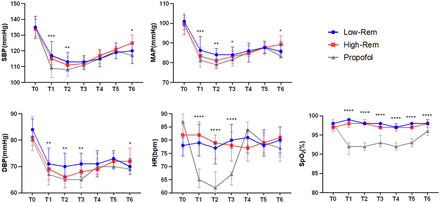 The incidence of hypotension was significantly lower in Low-Rem group (7%) and in High-Rem group (10.7%), when compared with Propofol group (26.8%) (p < 0.05; Table 3). The specific haemodynamic comparison results were detailed in Figure 2. The decrease in SBP was significantly higher in the propofol group than in the Low-Rem group at T1 and T2, and the decrease in SBP was higher in the propofol group than in the High-Rem group at T6 (p < 0.05). Moreover, the decrease in DBP was significantly higher in the propofol group than in the Low-Rem group at T1, T2 and T3, and the decrease in DBP was higher in the propofol group than in the High-Rem group at T6 (p < 0.05). Also, the decrease in MAP was significantly higher in the propofol group than in the Low-Rem group at T1, T2 and T3, and the decrease in MAP was higher in the propofol group than in the High-Rem group at T6 (p < 0.05). HR was significantly decelerated in the propofol group compared to the other two groups at T1, T2 and T3 (p < 0.05). SpO2 was significantly reduced in the propofol group compared to the other two groups from T1 to T6 (Figure 2).