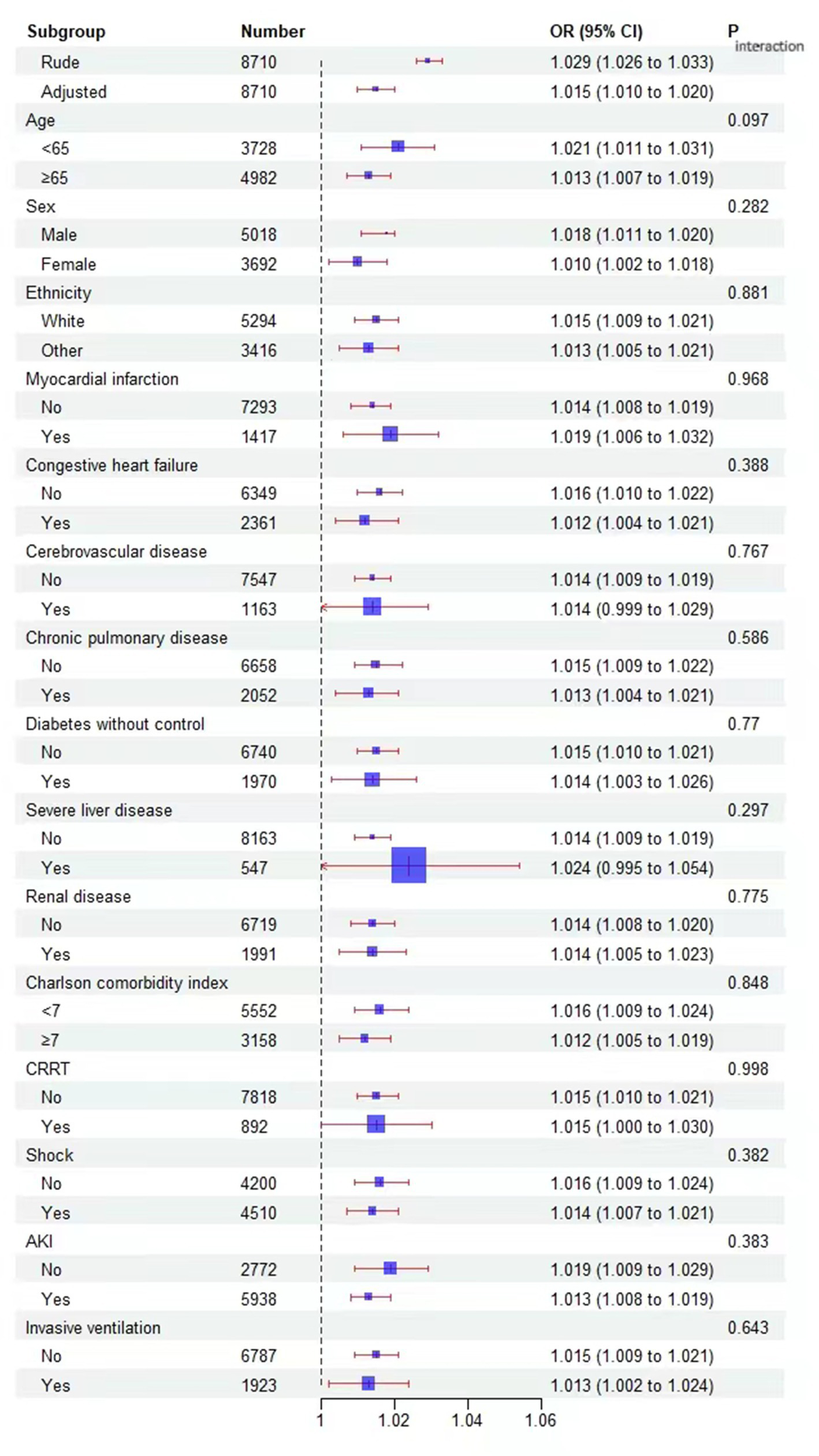 Subgroup analyses were conducted based on factors such as age (<65 and ≥ 65 years), sex, ethnicity, myocardial infarction, congestive heart failure, cerebrovascular disease, chronic pulmonary disease, diabetes without control, sever liver disease, renal disease, Charlson comorbidity index (<7 and ≥ 7), AKI, CRRT, invasive ventilation.
