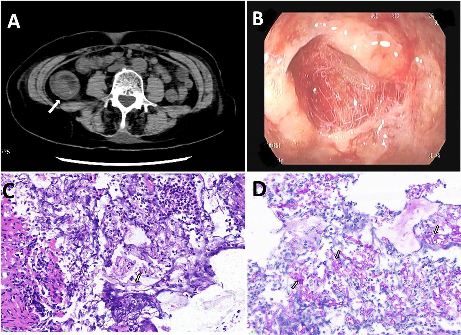 (A) Computed tomography (CT) revealed bowel wall thickening. (B) Gastroscopy revealed severe erosions, edema, and scattered superficial ulcers. (C,D) A broad, aseptate hyphae filamentous fungi was found in the intestinal tissue (Magnification: ×400). The tissue specimens were stained with Hematoxylin and Eosin staining (C), periodic acid Schiff (D).