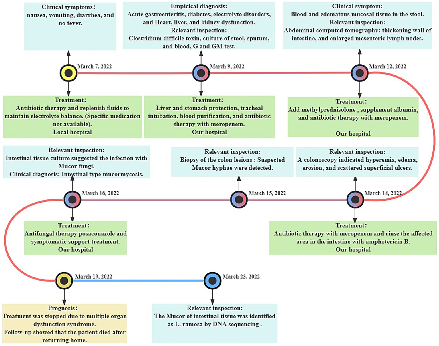 After admission, the patient was treated with meropenem, cefoperazone/sulbactam, and hormone therapy. Based on intestinal histopathologic and tissue culture results, a mucorales infection was suspected, and the patient was diagnosed with intestinal-type mucormycosis on March 16th. Posaconazole was administered immediately for antifungal treatment. Despite prompt intervention, the disease progressed rapidly. Regrettably, the patient’s family decided to discontinue treatment on March 19th, 2022, due to the presence of multiple organ dysfunction syndrome. Subsequent follow-up indicated that the patient passed away post-discharge (Figure 3).