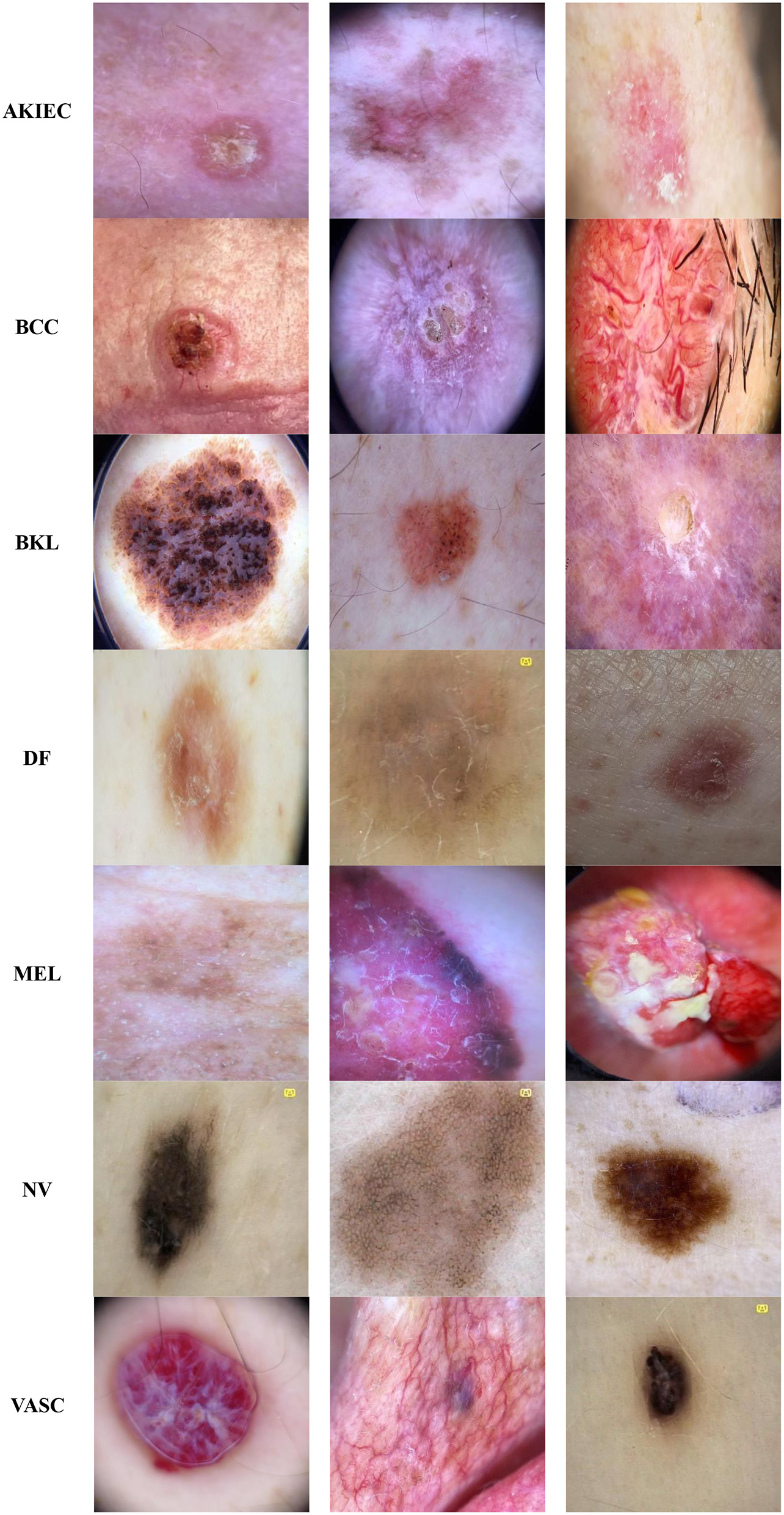 The Classification Task 3 Dataset consisted of images labeled with two classes according to Classification Task 3 to categorize the skin diseases into seven categories: AKIEC, BCC, BKL, DF, MEL, NV, & VASC. The dataset consisted of 46,935 images. The input images were 28 by 28 pixels, and the number of channels was 3. The dataset was split into three sets consisting of 30,508 images (65%) for training, 4,693 images (10%) for validation, and 11,734 images (25%) for testing. Figure 4 displays the class labels for Classification Task 3 and some images of skin lesions.
