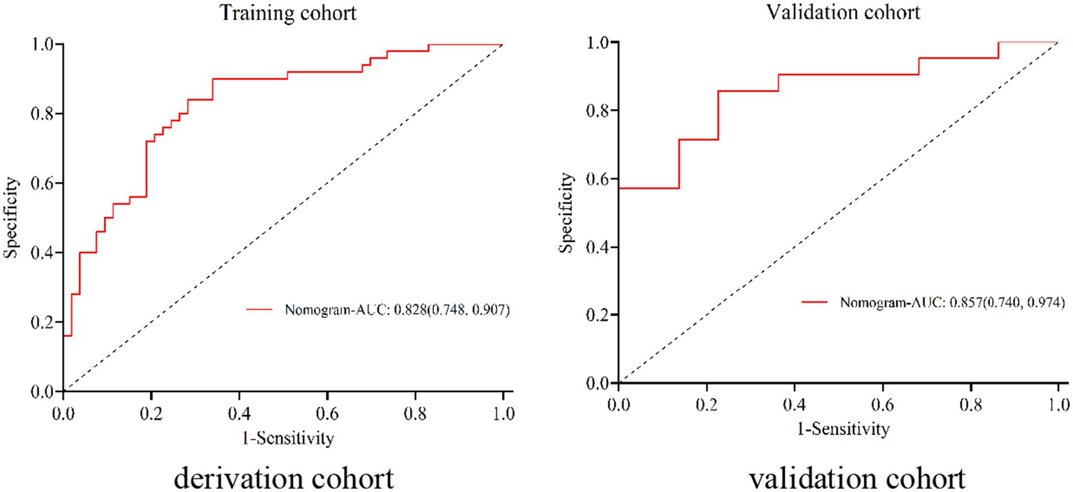 Based on the training cohort, the steps for constructing a predictive model are as follows: firstly, potential predictors of the outcome event are identified using single-factor logistic regression analysis (p < 0.05). For these selected variables, multiple-factor logistic regression analysis is conducted using stepwise (bidirectional) method. A column line chart is constructed based on variables with p < 0.05 from the stepwise method in order to build a predictive model. The constructed column line chart undergoes bootstrap sampling validation 1,000 times to draw a calibration curve for assessing model calibration and an HL test for evaluating model goodness-of-fit. Furthermore, receiver operating characteristic (ROC) curve analysis is performed to calculate metrics such as area under the curve (AUC), sensitivity, specificity, in order to evaluate its discriminatory performance. Clinical decision curves (DCA) are created to assess the clinical utility of the model by quantifying net benefits within threshold probability ranges. Finally, the constructed model is validated in a validation cohort.