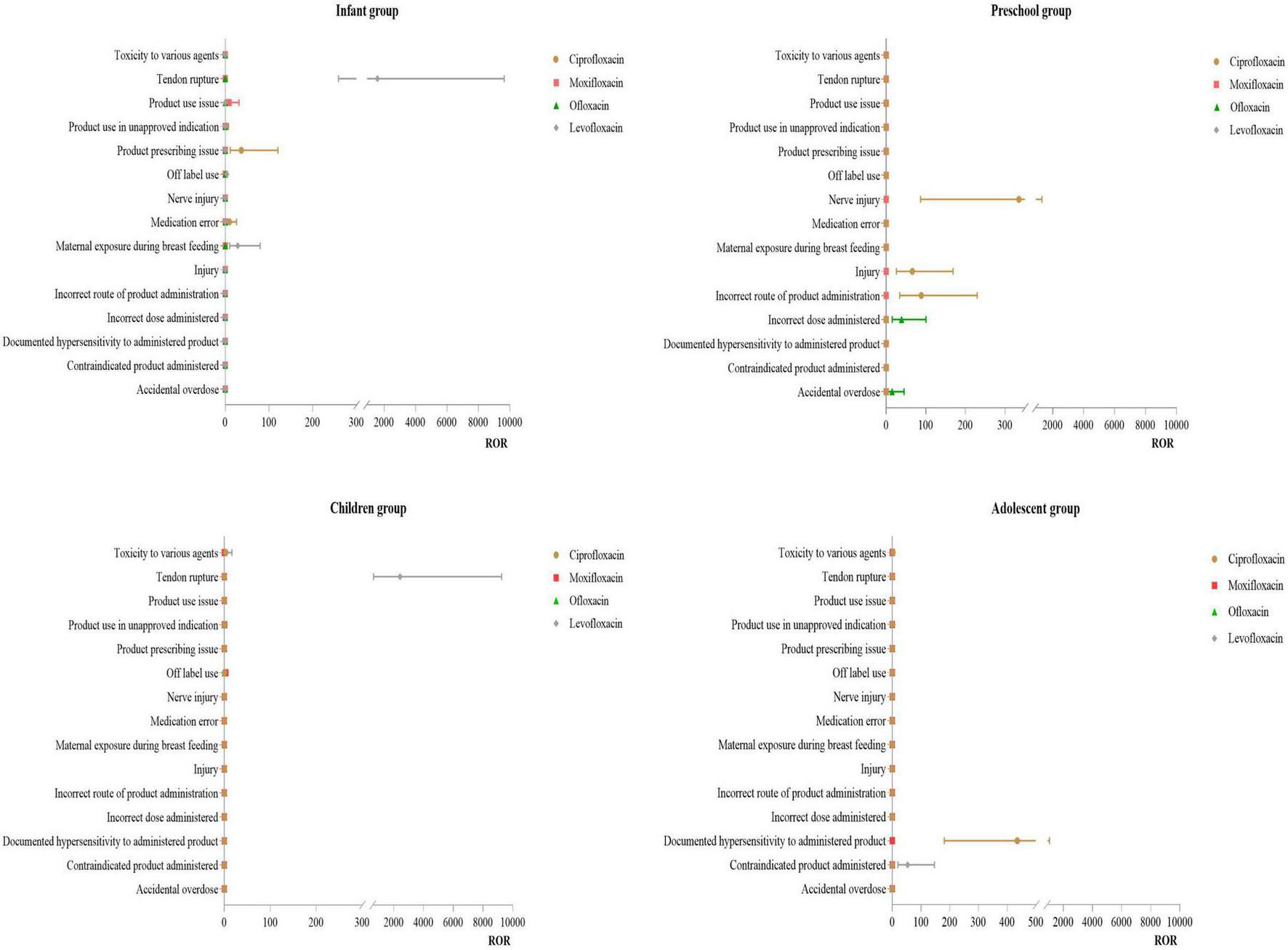 Infant Group: For ciprofloxacin, the primary PT was product prescription issues (ROR:36.92). For levofloxacin, the main of PT were tendon rupture (ROR:1579.91) and exposure during breast feeding (ROR:28.53). Preschool Group: For ciprofloxacin, the primary PT were nerve injury (ROR:334.82) and incorrect route of drug administration (ROR:88.64). Children Group: For levofloxacin, the main PT was tendon rupture (ROR:2417.07). Adolescent Group: For ciprofloxacin, the primary PT was documented hypersensitivity to the administered product (ROR:435.41). For more details, see Figure 2.