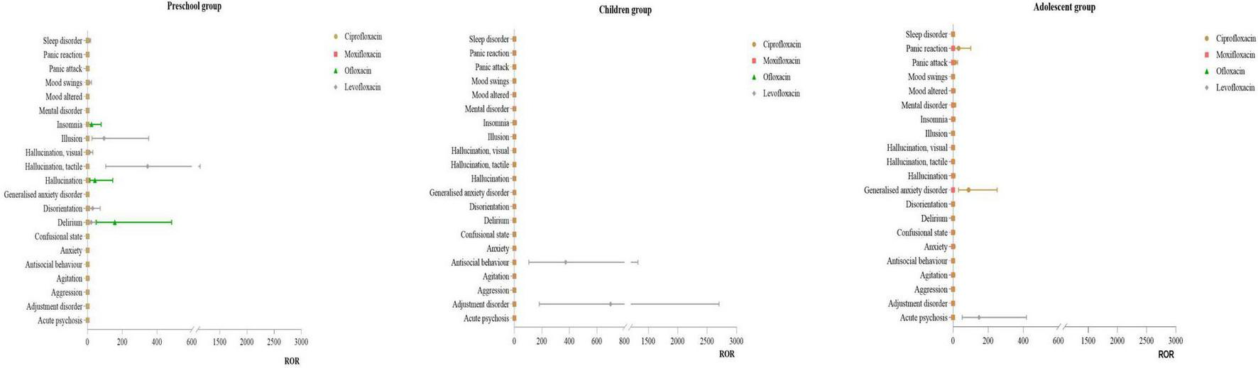 Infant Group: No effective signals were detected for this SOC. Preschool Group: For levofloxacin, the primary PT were hallucination, tactile (ROR: 345.17) and illusion (ROR:94.40). For ofloxacin, the main PT were delirium (ROR:156.47) and hallucination (ROR:41.78). Children Group: For levofloxacin, the primary PT were adjustment disorder (ROR:698.73) and antisocial behavior (ROR:372.62). No effective signals were detected for other drugs. Adolescent Group: For ciprofloxacin, the main PT was generalized anxiety disorder (ROR:88.33). For levofloxacin, the primary PT was acute psychosis (ROR:147.84). For more details, see Figure 3.