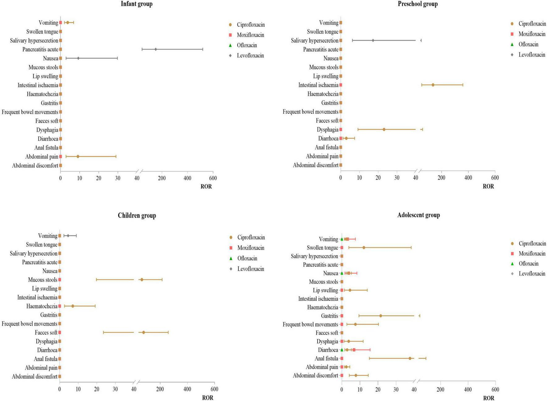 Infant Group: For ciprofloxacin, the primary PT was abdominal pain (ROR:9.11). For levofloxacin, the main PT were pancreatitis acute (ROR:150.42) and nausea (ROR:9.27). Preschool Group: For ciprofloxacin, the primary PT were intestinal ischemia (ROR: 135.61) and dysphagia (ROR: 23.10). For levofloxacin, the main PT was salivary hypersecretion (ROR:17.23). Children Group: For ciprofloxacin, the primary PT were faces soft (ROR:78.15) and mucous stools (ROR:65.12). Adolescent Group: Ciprofloxacin had multiple effective signals, including anal fistula (ROR:37.67), gastritis (ROR:21.49), and swollen tongue (ROR:12.19). For moxifloxacin, the primary PT was diarrhea (ROR:6.75). For more details, see Figure 5.