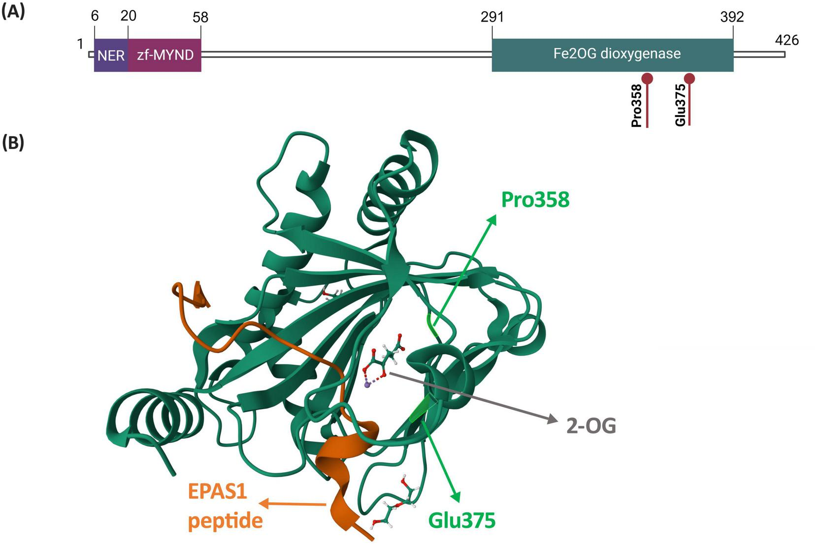 Structure of the EGLN1 protein highlighting amino acids p.Pro358 and p.Glu375. (A) Localization of amino acids p.Pro358 and p.Glu375 within a schematic representation of the EGLN1 protein and its domains. Figure was created based on information from Uniprot database (28). (B) Localization of amino acids p.Pro358 and p.Glu375 on the EGLN1 structure in complex with 2-oxoglutarate and the EPAS1 peptide, which contains the oxygen-dependent domain. The EGLN1 complex was retrieved from Protein Data Bank (PDB ID: 7Q5X; (29)). Abbreviations: NER, nuclear export region; zf-MYND, MYND-type zinc finger domain; Fe2OG dioxygenase, Fe(II) and 2-oxoglutarate dependent dioxygenase domain, also prolyl hydroxylase domain (PHD); 2-OG, 2-oxoglutarate.