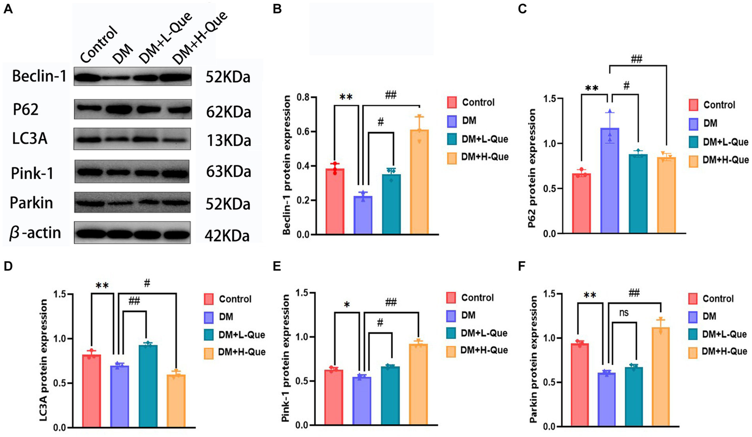 Figure 5. Quercetin promotes autophagy to ameliorate spleen injury in GK rats. (A) Western blot gel images of spleen tissues in each group (n = 8). (B–F) The bar graphs represent the quantification of gel bands (Expression of Beclin1, P62, LC3A, Pink1, and Parkin, mean ± SD). **p < 0.01, comparison with the control group; *p < 0.05, comparison with the control group; ##p < 0.01, comparison with model group; #p < 0.05, comparison with model group, and ns >0.05 shows no difference.