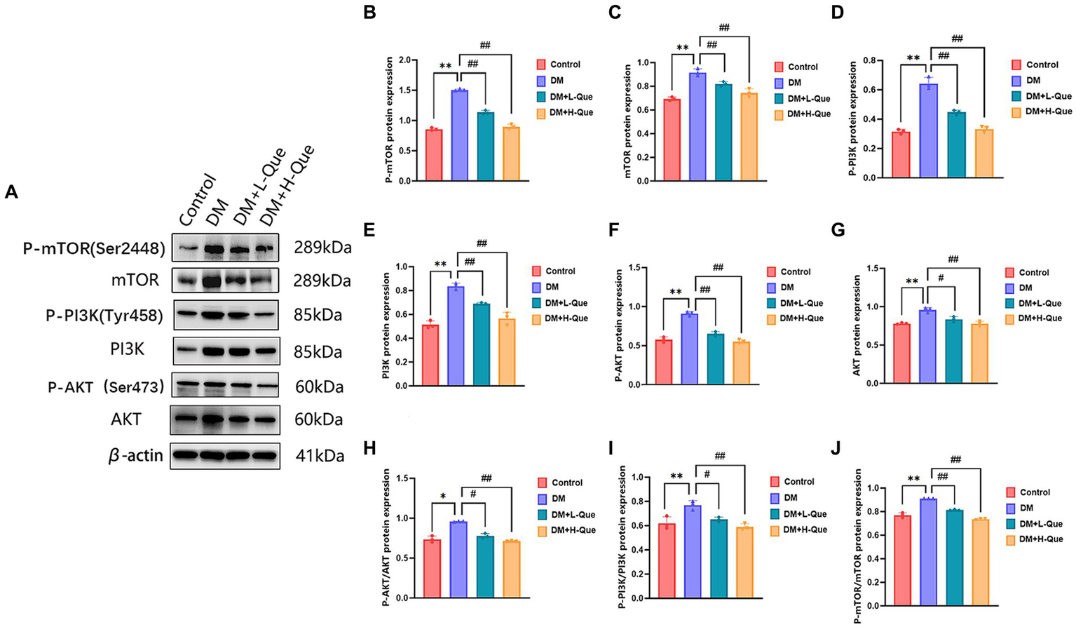 In immunohistochemically stained sections, AKT is predominantly expressed in the hepatocyte membranes in the liver. The percentage area of hepatocyte membranes containing AKT protein is higher in the DM group (98.08%) compared to the control group. Compared to the DM group, the percentage area of hepatocyte membranes containing AKT protein is lower in the DM + L-Que group (90.78%) and significantly lower in the DM + H-Que group (88.44%) (Figure 3F). mTOR is extensively expressed in liver tissue, primarily in the cytoplasm. The percentage area of hepatocyte cytoplasm containing mTOR protein is higher in the DM group (98.08%) compared to the control group. Compared to the DM group, the percentage area of hepatocyte cytoplasm containing mTOR protein is lower in the DM + L-Que group (93.55%) and in the DM + H-Que group (92.33%) (Figure 3F). P62 is extensively expressed in liver tissue, primarily in the cytoplasm. The percentage area of hepatocyte cytoplasm containing P62 protein is higher in the DM group (98.94%) compared to the control group. Compared to the DM group, the percentage area of hepatocyte cytoplasm containing P62 protein is lower in the DM + L-Que group (91.93%) and significantly lower in the DM + H-Que group (78.69%) (Figure 3F). LC3 is expressed at low levels in the liver with a low positive rate, but the positive rate in the DM group (17.76%) is significantly higher than in the control, DM + L-Que, and DM + H-Que groups, primarily expressed in the cytoplasm of hepatocytes around the tissue edges and vascular areas (Figure 3F).