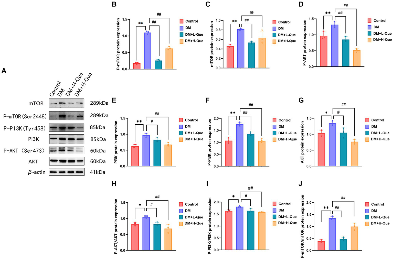 Figure 7. Quercetin can modulate the PI3K/AkT/mTOR pathway and improve spleen injury in GK rats. (A) Western blot gel images of spleen tissues in each group (n = 8). (B–J) The bar graphs represent the quantification of gel bands (Expression of PI3K, P-PI3K, Akt, P-AKT, mTOR, and P-mTOR, mean ± SD). **p < 0.01, comparison with the control group; *p < 0.05, comparison with the control group; ##p < 0.01, comparison with model group; #p < 0.05, comparison with model group, and ns >0.05 shows no difference.
