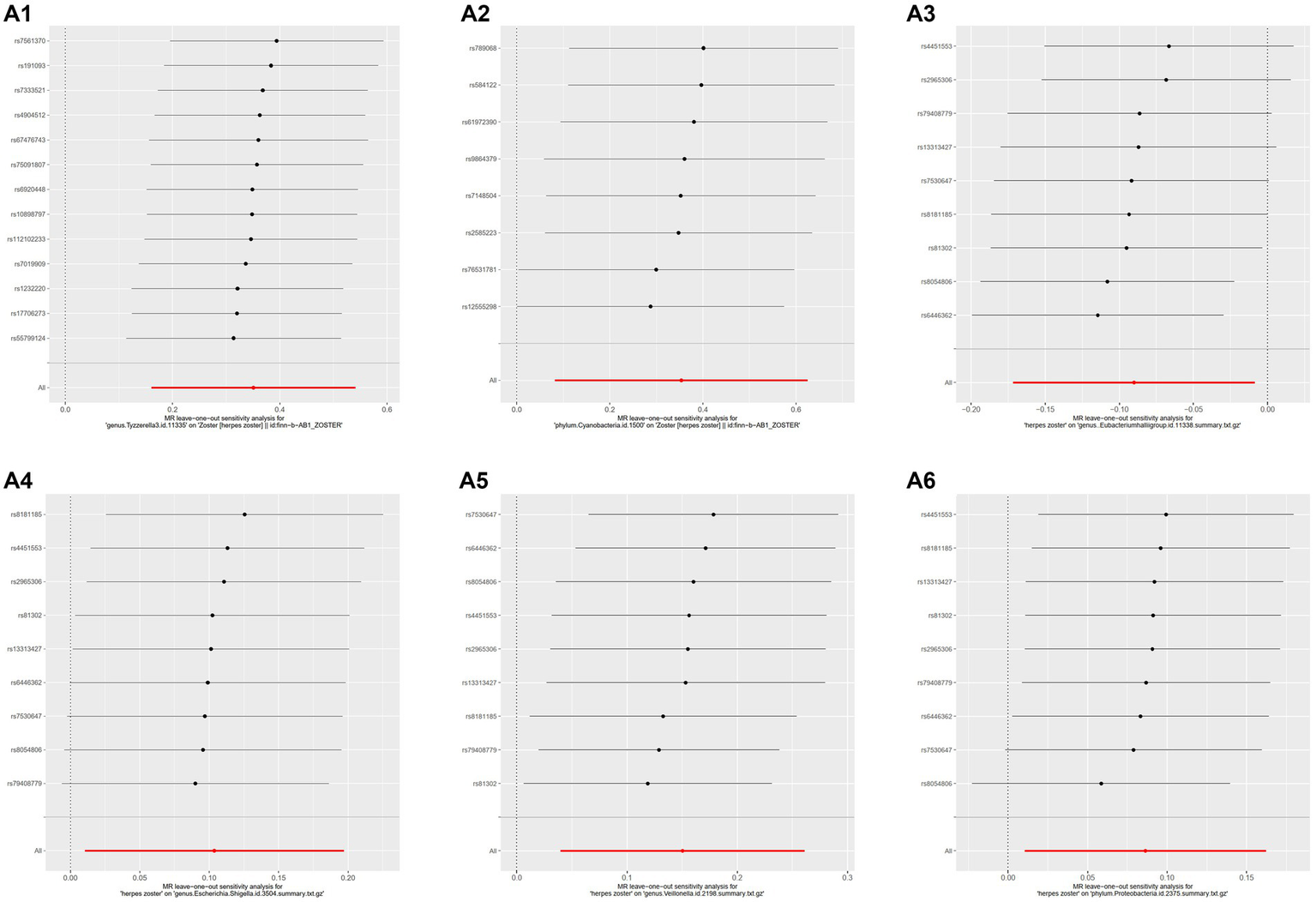 Results of leave-one-out analysis of several gut microbiota. MR analysis: A1, genus.Tyzzerella3; A2, phylum.Cyanobacteria. Reverse MR analysis: A3, genus.Eubacteriumhallii group; A4, genus.Escherichia.Shigella; A5, genus.Veillonella; A6, phylum.Proteobacteria.
