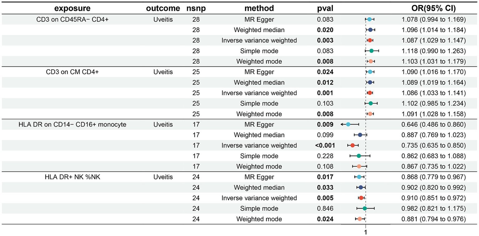 Figure 4. Forest plots showed the causal associations between immune cell traits and uveitis by using different methods.