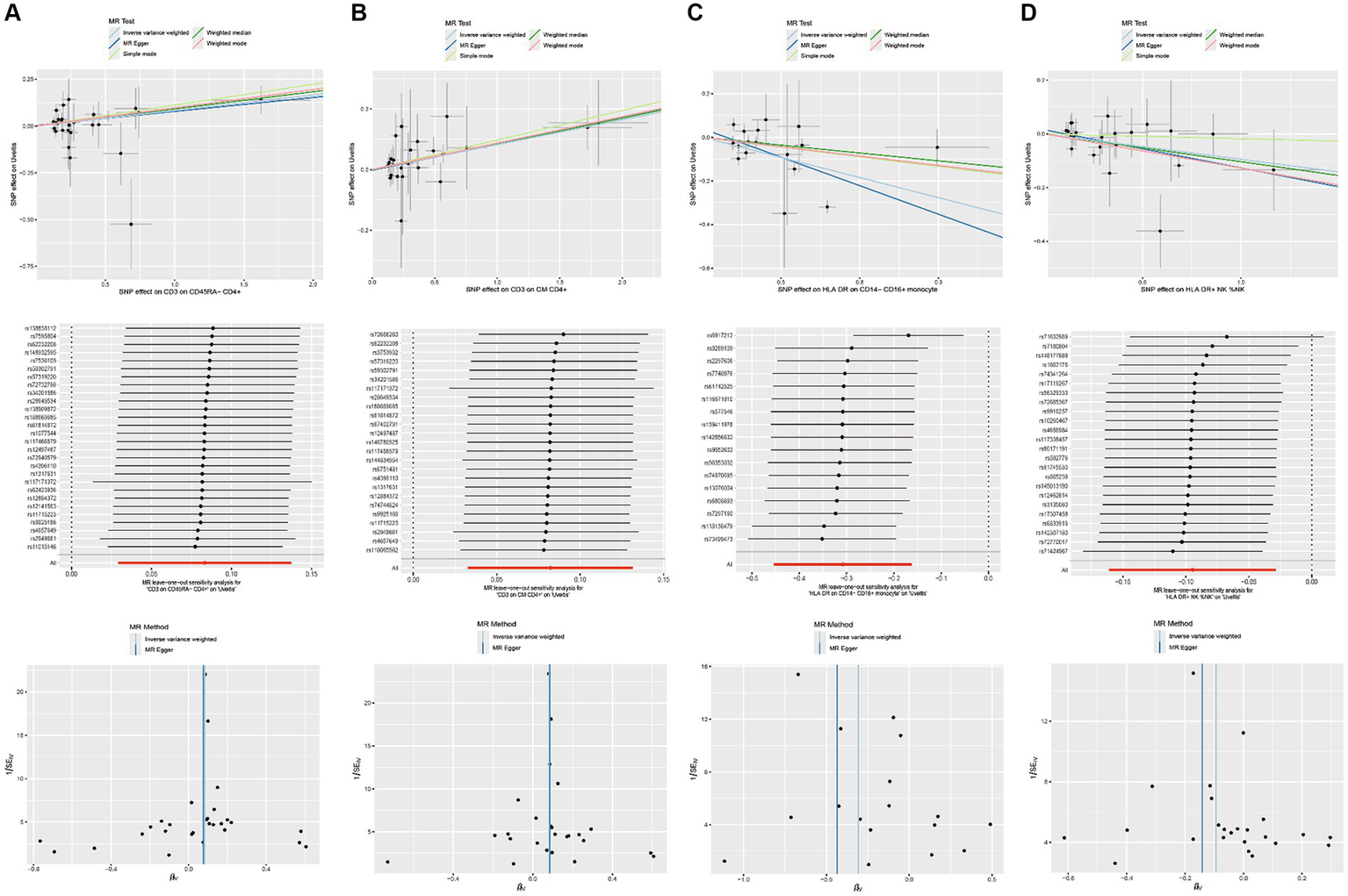 Figure 3. Scatterplots, leave-one-out analysis, and funnel plots showed the causal associations between immune cell traits and uveitis by using different methods. (A) CD3 on CD45RA− CD4+ cells. (B) CD3 on CM CD4+ cells. (C) HLA DR on CD14− CD16+ monocyte cells. (D) HLA DR on NK cells.