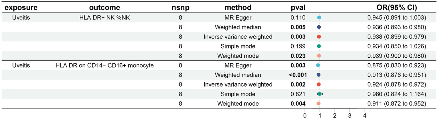 In particular, the ratio of HLA DR levels in NK cells to uveitis risk (OR) was assessed with the IVW method and was 0.938 (95% confidence interval (CI) 0.899–0.979; p = 0.003, Figure 4; Supplementary Table S5), and the ratio of HLA DR on CD14− CD16+ monocyte to uveitis risk (OR) was assessed with the IVW method and was 0.924 (95% confidence interval (CI) 0.878–0.972; p = 0.003, Figure 4; Supplementary Table S6).