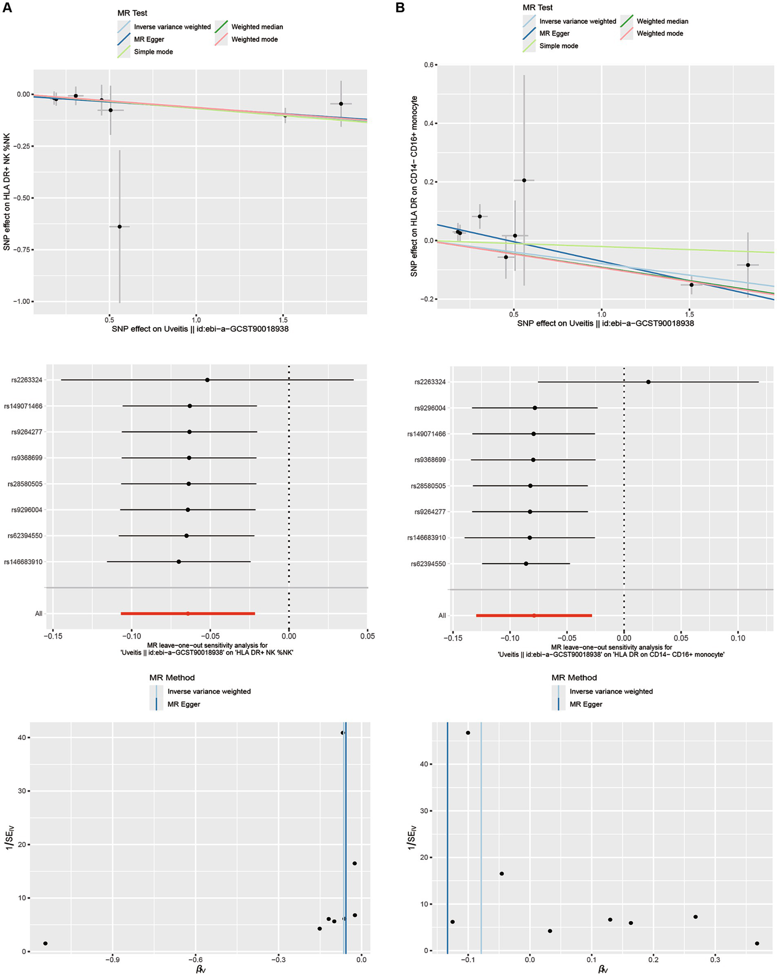 Figure 5. Scatterplots, leave-one-out analysis, and funnel plots showed the causal associations between uveitis and immune cell traits by using different methods. (A) HLA DR on NK cells. (B) HLA DR on CD14− CD16+ monocyte cells.