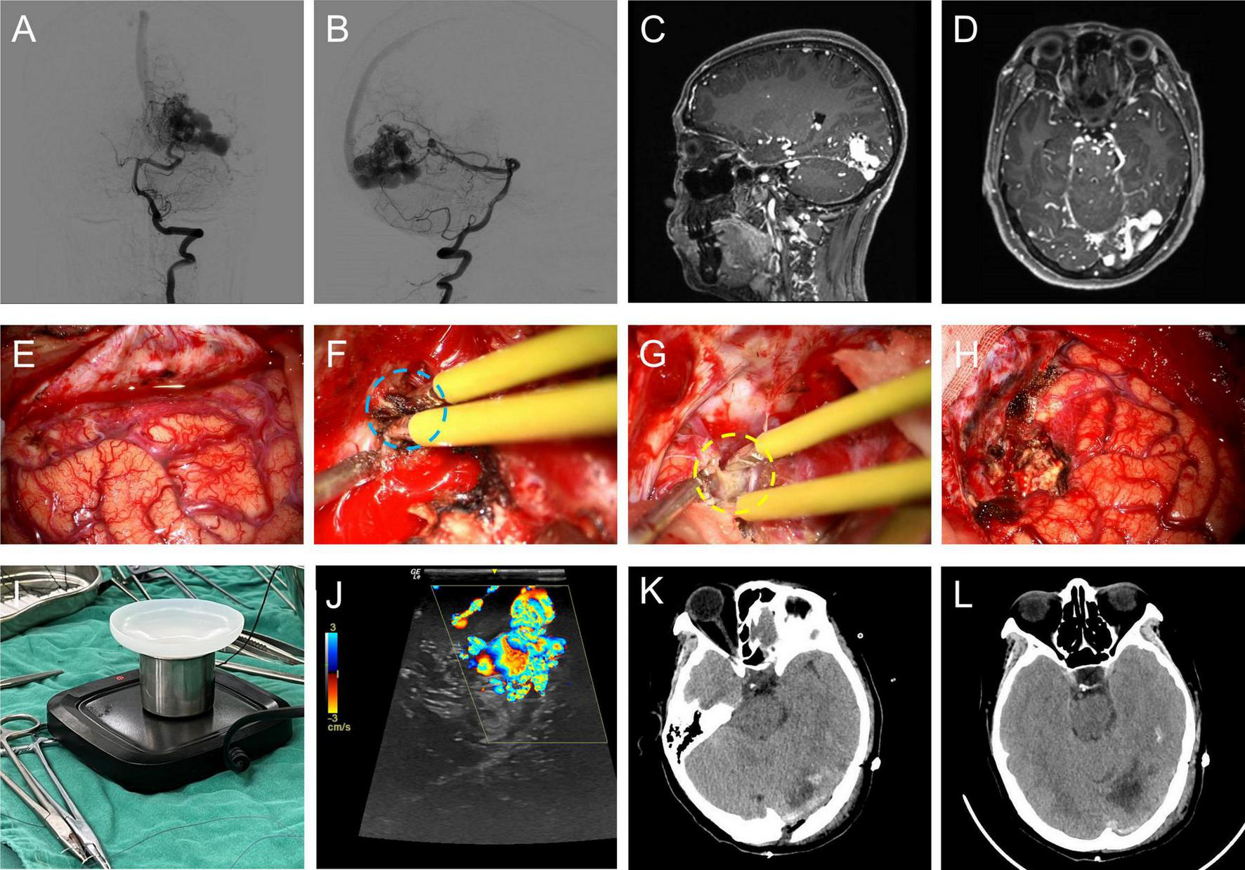 A typical case of brain AVM microsurgery using bone-wax coated bipolar electrocoagulation for hemostasis intraoperatively. Anterior (A) / Lateral (B) DSA image of the left vertebral artery; sagittal (C) / horizontal (D) MRA image of the brain AVM; (E) the exposed occipital cortex; intraoperative hemostasis using conventional bipolar electrocoagulation (F) / bone-wax coated bipolar electrocoagulation (G); (H) occipital cortex after resection of the brain AVM lesion; (I) intraoperative photograph of the bone-wax coated bipolar electrocoagulation application device; (J) intraoperative ultrasound exploration of the brain AVM lesion; CT image of the operated area on the first day of postoperative review (K) / on the fifth day of postoperative review (L).