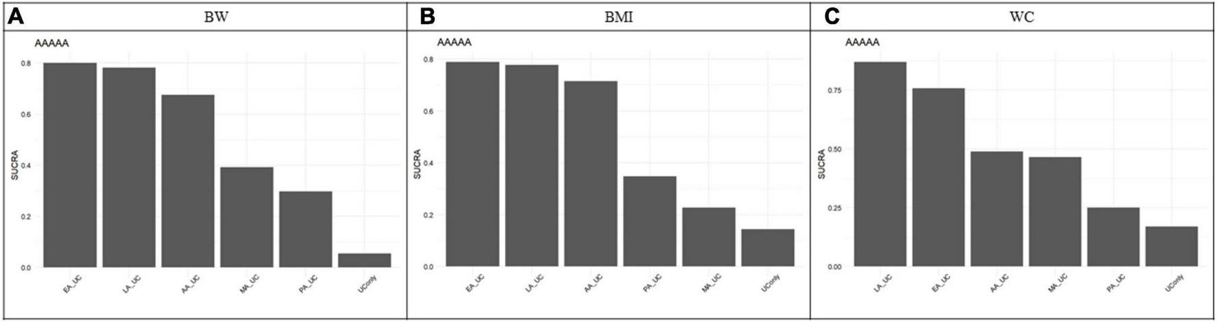 The PMA was performed to assess the effectiveness of various acupuncture treatments in combination with UC versus UC alone on BW. The difference was significant for EA+UC versus UC alone (MD = 2.46, 95% CI = 1.12 to 3.80). For AA, no studies with this design were performed. In addition, various acupuncture treatments in combination with UC versus PA combining with UC for BW showed significance for LA+UC vs. PA+UC (MD = 1.90, 95% CI = 1.25 to 2.55), and one study was included (Supplementary Figures 2a, b).