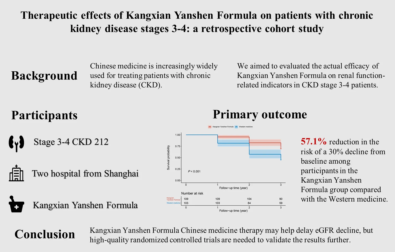 The figure summarizes the retrospective cohort study on the therapeutic effects of Kangxian Yanshen Formula in patients with chronic kidney disease stages 3–4. The study background, participants, primary outcome, and conclusion are presented. The primary outcome graph shows a 57.1% reduction in the risk of a 30% decline from baseline eGFR among participants in the Kangxian Yanshen Formula group compared to the Western medicine group.