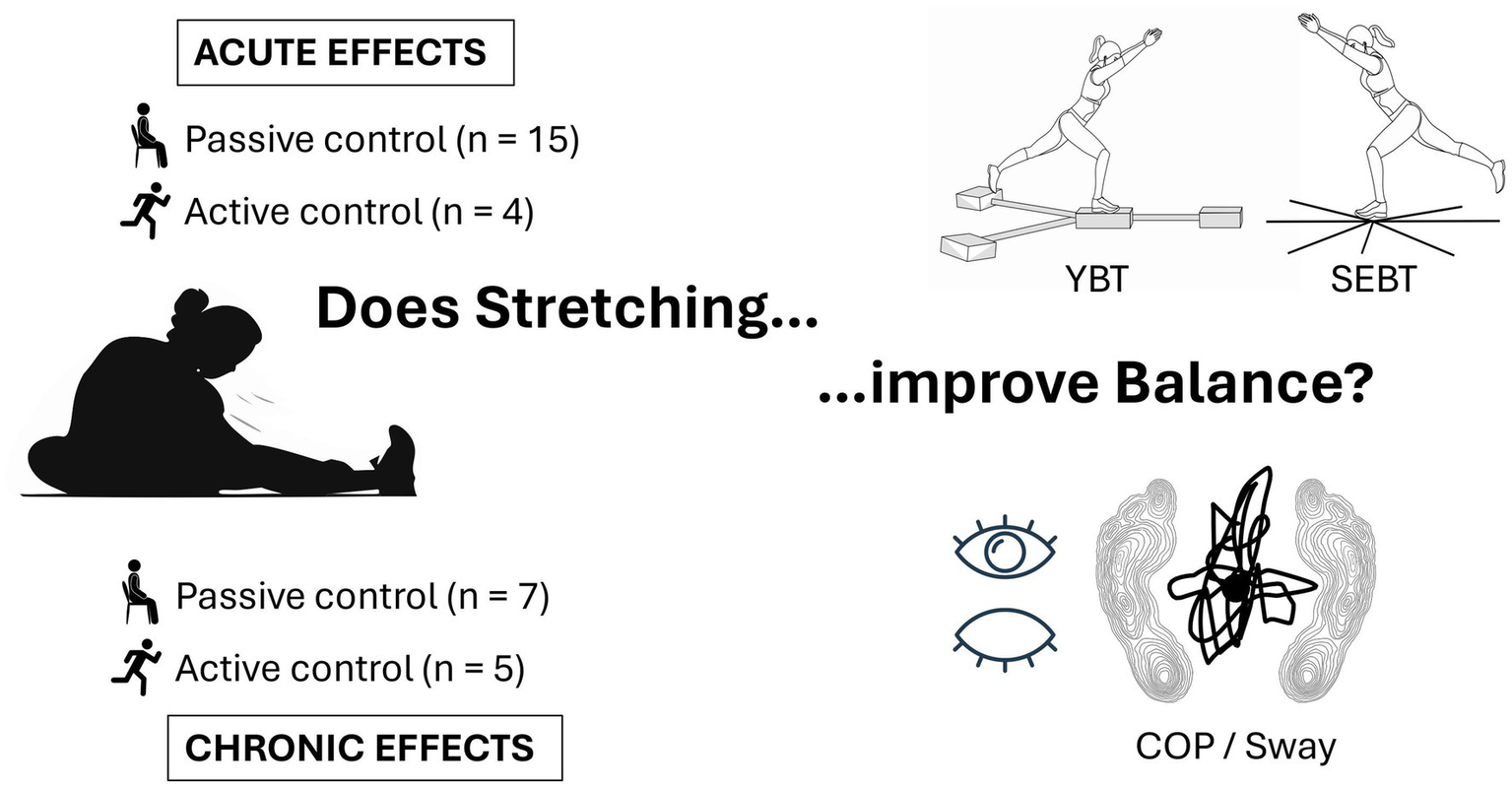 While recent literature discusses the potential of replacing strength training with high-volume stretching when aiming to increase muscle strength and size (27, 28), to date, no review has examined whether stretching has acute or chronic effects on balance. Thus, the objective of this systematic review with meta-analysis was to quantify the overall available evidence for the implementation of stretching to improve balance since the literature is too scarce for population-specific calculations – and thereby explore a possible new perspective for training and therapy.