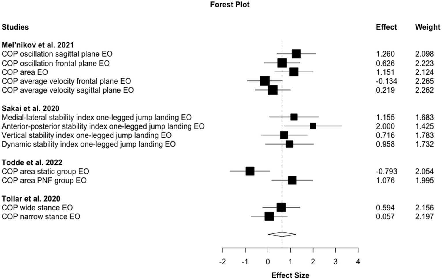 Additionally, four of these 14 studies included static standing sway/COP tests with eyes closed, whereby two (53, 55) found significant positive effects, one (74) no difference and one (52) significant negative effects. The meta-analytical calculation exhibited a significant, trivial magnitude effect (ES: 0.19 95%CI 0.08–0.31, p = 0.010, τ2 = 0) when including all stretching types, with the subgroups for static and PNF stretching not reaching the level of significance (p = 0.070–0.635).