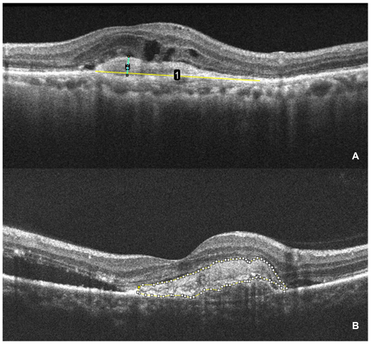 The measurement of SHRM. (A) OCT scan showing the maximum width (yellow line 1) and thickness (green line 2) of the SHRM which measured with ImageJ. (B) The area of SHRM was also measured with ImageJ. The yellow line traces the area of SHRM, and the software automatically calculates the area value.