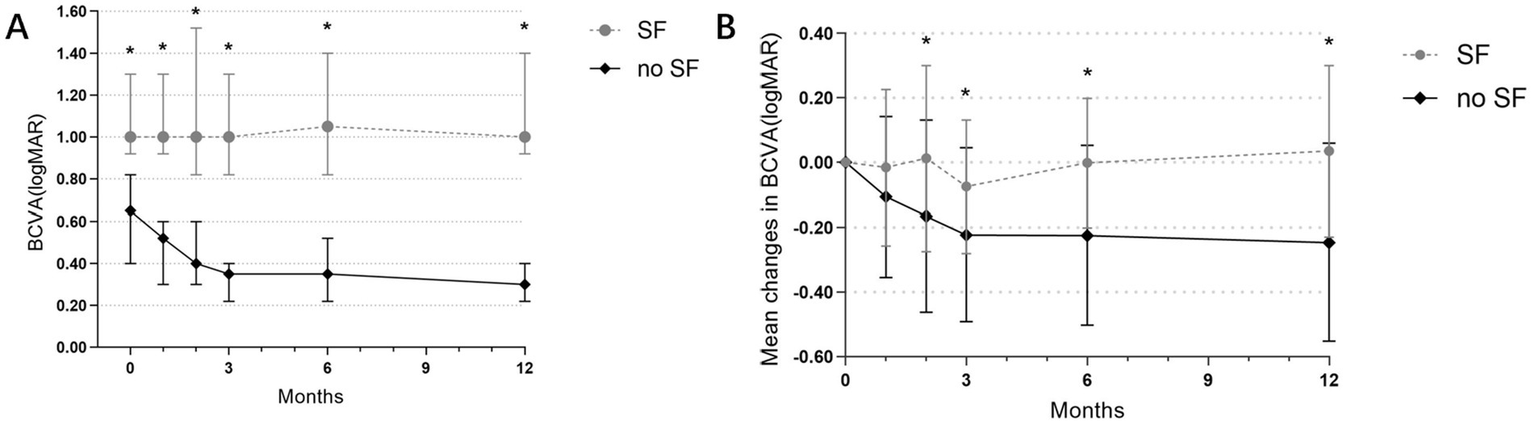 (A) Evolution of BCVA (logMAR) at each visit in the SF and non-SF groups before and after anti-VEGF treatment. *The difference in BCVA between the two groups was statistically significant. (B) Changes in mean BCVA before and after treatment in both groups. *The difference in the change in mean BCVA (logMAR) between the two groups was statistically significant.