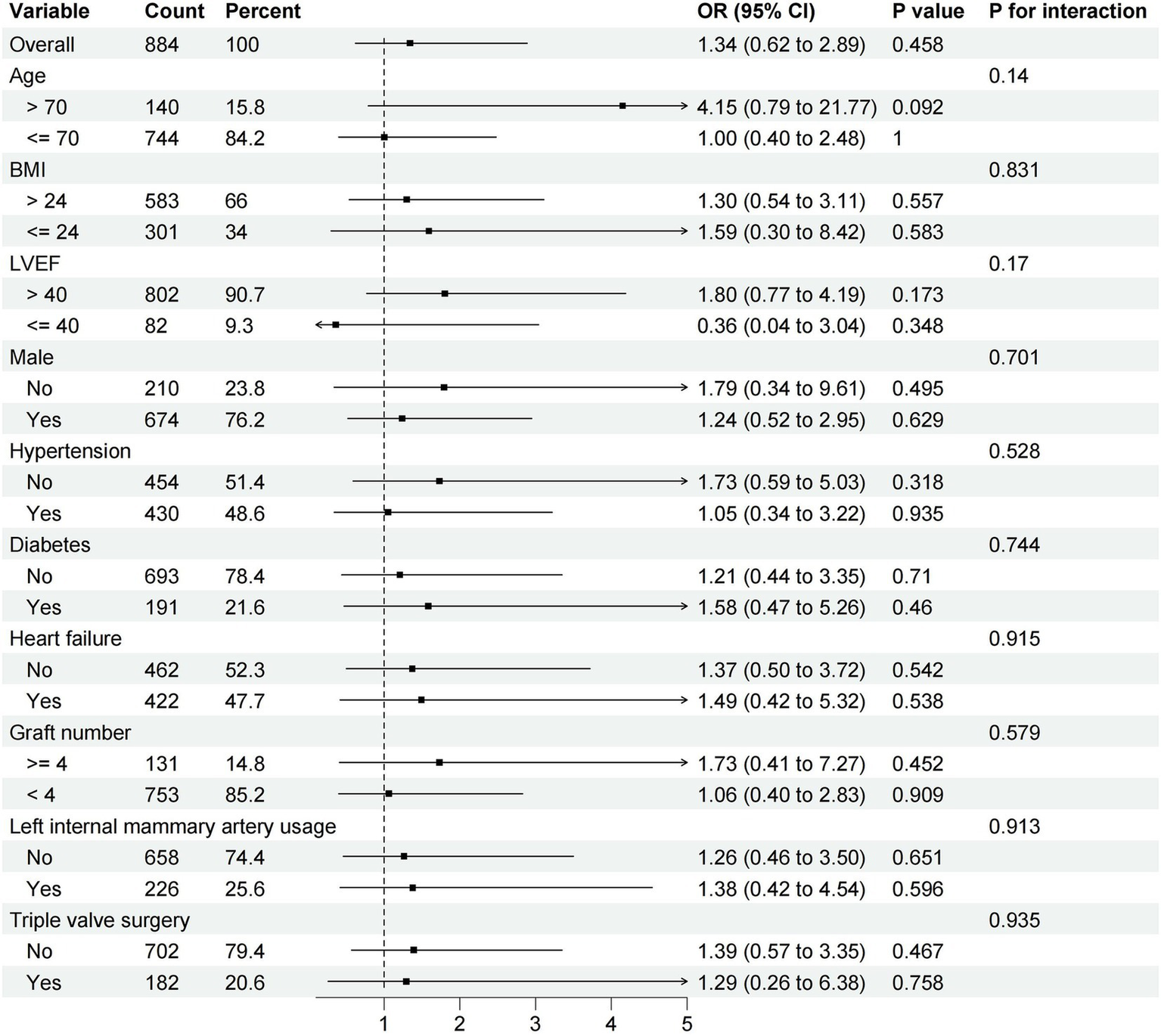 To mitigate selection bias and address potential confounding factors between the groups, we employed propensity score matching (PSM) and inverse probability of treatment weighting (IPTW) analysis to adjust for discrepancies in the baseline characteristics of the patients. PSM was performed using the 1:1 nearest neighbor matching method and optimal matching with a caliper width of 0.3 standard deviations. The following baseline covariates included in the PSM model were age, male, hypertension, diabetes, chronic kidney disease, body mass index, left ventricular ejection fraction troponin I and brain natriuretic peptide. These covariates were selected for inclusion in the models based on the fact that they are commonly associated risk factors for poor prognosis in cardiac surgery and after incorporating these covariates, no model-fitting issues were identified, and a satisfactory balance between treatment groups was achieved following weighting, with no extreme weights observed. These covariates were also included in the multivariate logistic regression model. The propensity scores were converted to IPTW with OPCABG patients having a weighting of 1. Logistic regression was then used on PSM and IPTW models to estimate odds ratios (ORs) and 95% confidence intervals (CIs) for independent correlations between OPCABG groups and perioperative outcomes.