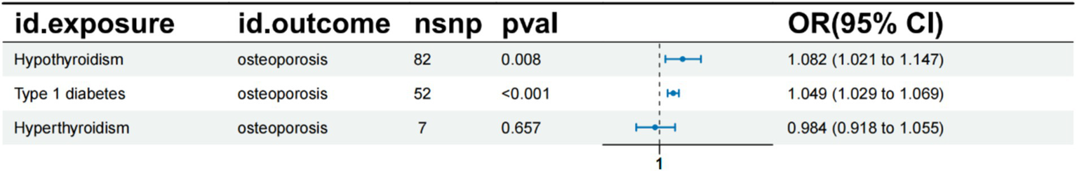 Diabetes mellitus is a known risk factor for OP and fractures, with patients with type 1 diabetes mellitus having an elevated risk of developing OP (28). Therefore, type 1 diabetes was included in this study for MVMR analysis. The results indicated that hyperthyroidism was no longer a risk factor for OP (OR = 0.984, 95% CI: 0.918–1.055, p = 0.657). However, hypothyroidism remained a risk factor for OP (OR = 1.082, 95% CI: 1.021–1.147, p = 0.008), and type 1 diabetes also emerged as a risk factor for OP (OR = 1.049, 95% CI: 1.029–1.069, p < 0.001) (Figure 5).