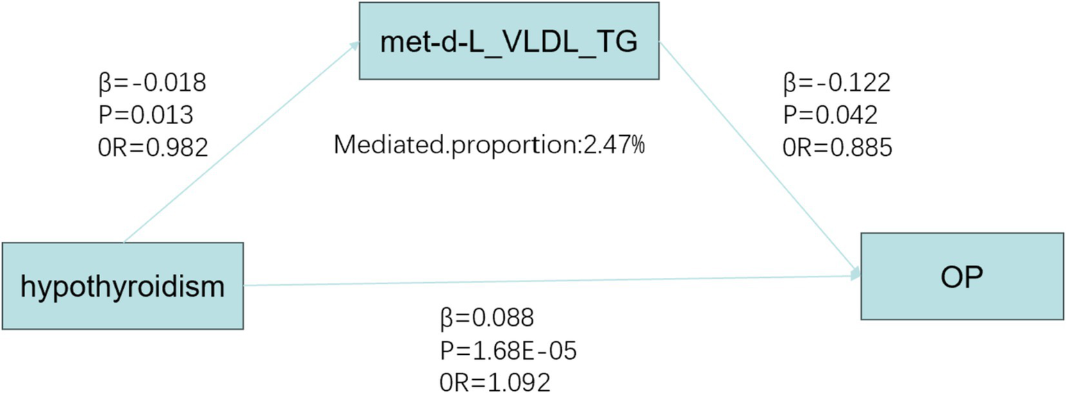 Mediated Mendelian analysis. OP, osteoporosis; OR, odds ratio; met-d-L_VLDL_TG, Triglycerides in large very low-density lipoprotein.