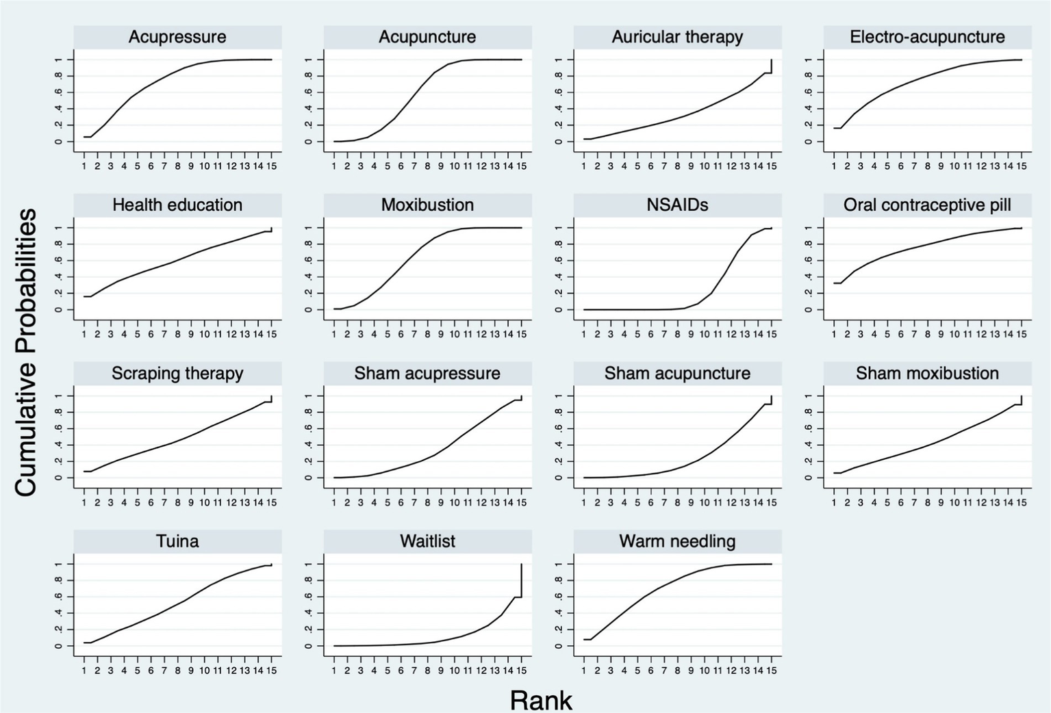 Figure 5 shows the SUCRA probability ranking for the different treatment effects of all interventions. For the 15 interventions, the SUCRA value predicted the possibility of different interventions as the best treatment on the management of PD pain, and the ranking was as follows: oral contraceptive pill (75.8%), electro-acupuncture (73.0%), acupressure (72.9%), warm needling (70.6%), moxibustion (64.9%), acupuncture (60.0%), health education (59.7%), tuina (52.3%), scarping therapy (48.0%), sham moxibustion (43.1%), sham acupressure (34.8%), auricular therapy (34.1%), sham acupuncture (24.9%), NSAIDs (23.9%), and waitlist (12.1%).