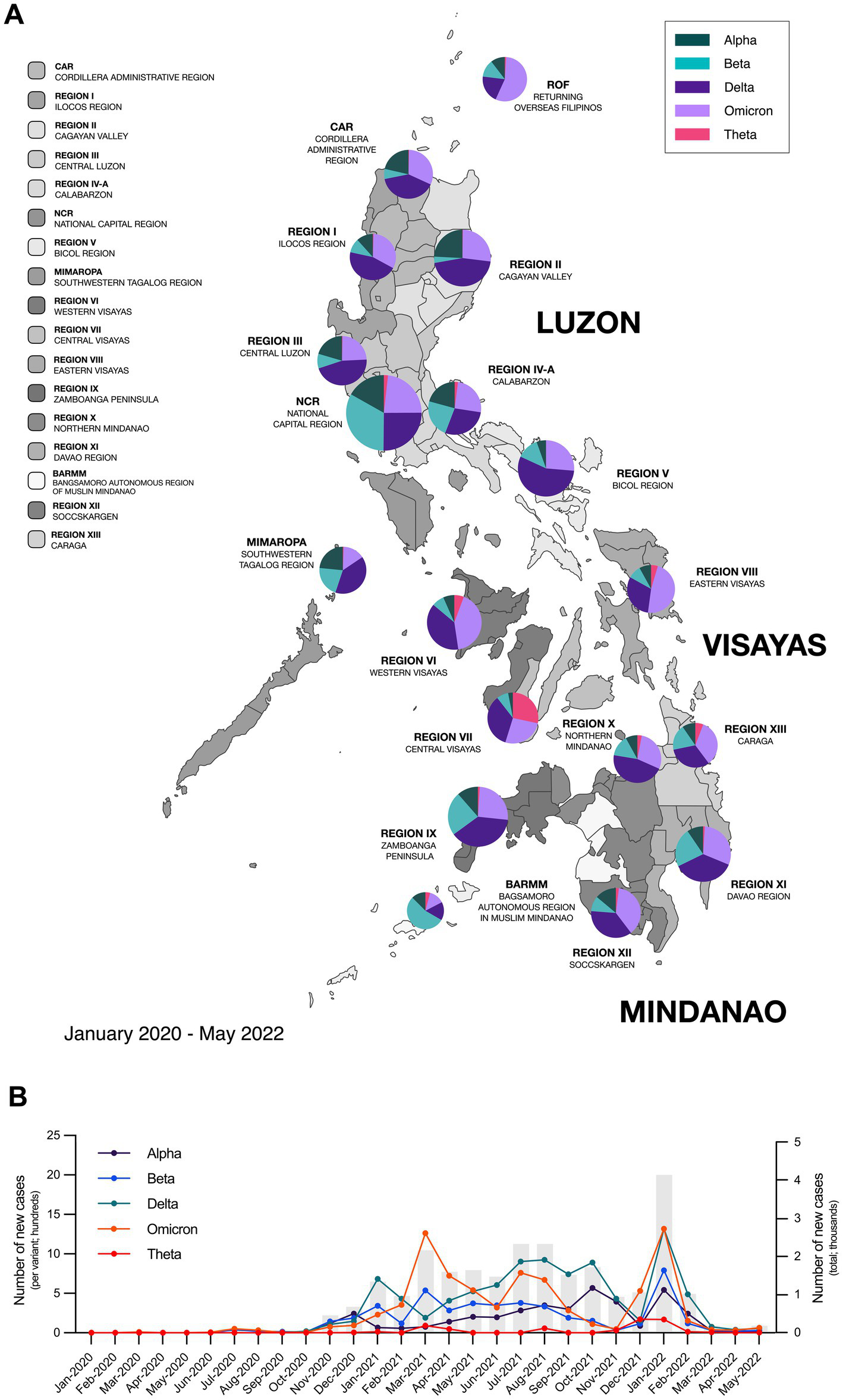 Different SARS-CoV-2 variants circulated throughout the Philippines from 2020–2022. (A) Map of the Philippines showing the distribution of circulating SARS-CoV-2 variants from January 2020 to May 2022 across the different regions in the country. (B) Epidemiological curve showing the number of new SARS-CoV-2 cases monthly in the Philippines and the incidence of different SARS-CoV-2 variants from January 2020 to May 2022. Bars represent the total number of new cases; data points on the line graph represent the number of new cases per variant; while pie charts show the percentage of circulating variants per region. Epidemiological data was provided by the Core Facility for Bioinformatics of the Philippine Genome Center.