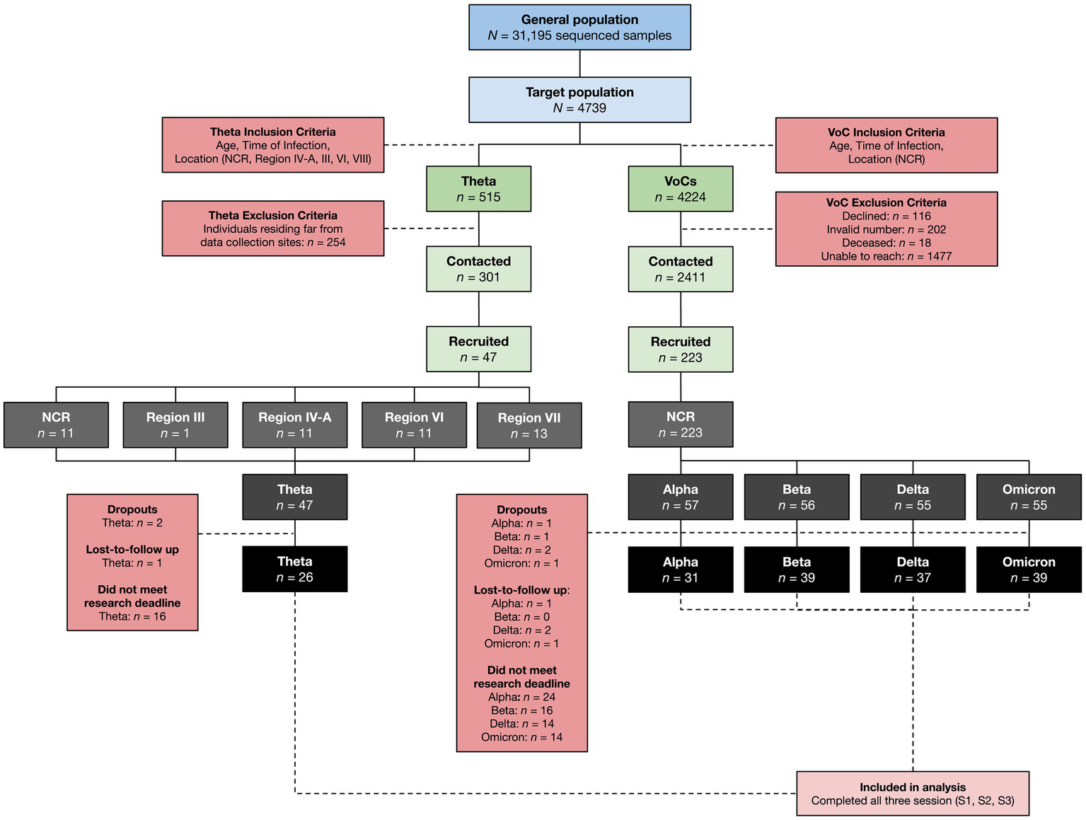 Research participant selection. SARS-CoV-2 cases from the NCR, Region III, Region IV-A, Region VI, and Region VII confirmed using Next Generation Sequencing from January 2021 to January 2022 were recruited into the study using an inclusion criteria based on location, time of infection, and age. Only data from those who completed the initial interview (S1) and both follow-up interviews (S2, S3) were included in the final analysis.