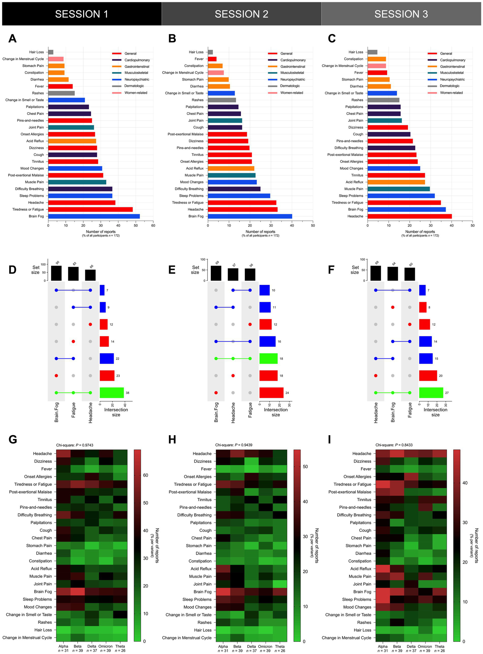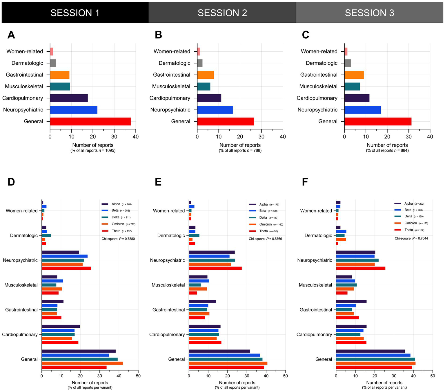 Long COVID symptoms were reported in 88, 82, and 68% of participants in S1, S2, and S3, respectively, showing declining incidence with elapsed time since the first reported infection. General symptoms including headache, fatigue, and post-exertional malaise were the most frequently reported symptoms, while neuropsychiatric symptoms were the second most frequently reported symptoms. In all three (3) sessions, intermittent brain fog, fatigue, and headache were the most frequently reported symptoms in all SARS-CoV-2 variant cohorts. Factors such as age, sex, comorbidities, and disease severity influenced symptom frequency, providing insight into the risk factors that contribute to the prevalence of this disease.