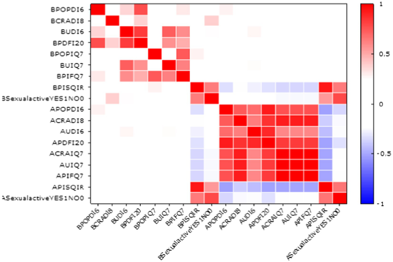 Correlation between sexual activity and symptomatic domains of questionnaire (red colors represent positive correlations, while blue colors denote negative correlations, the darker or more saturated the color—the stronger the relationship).
