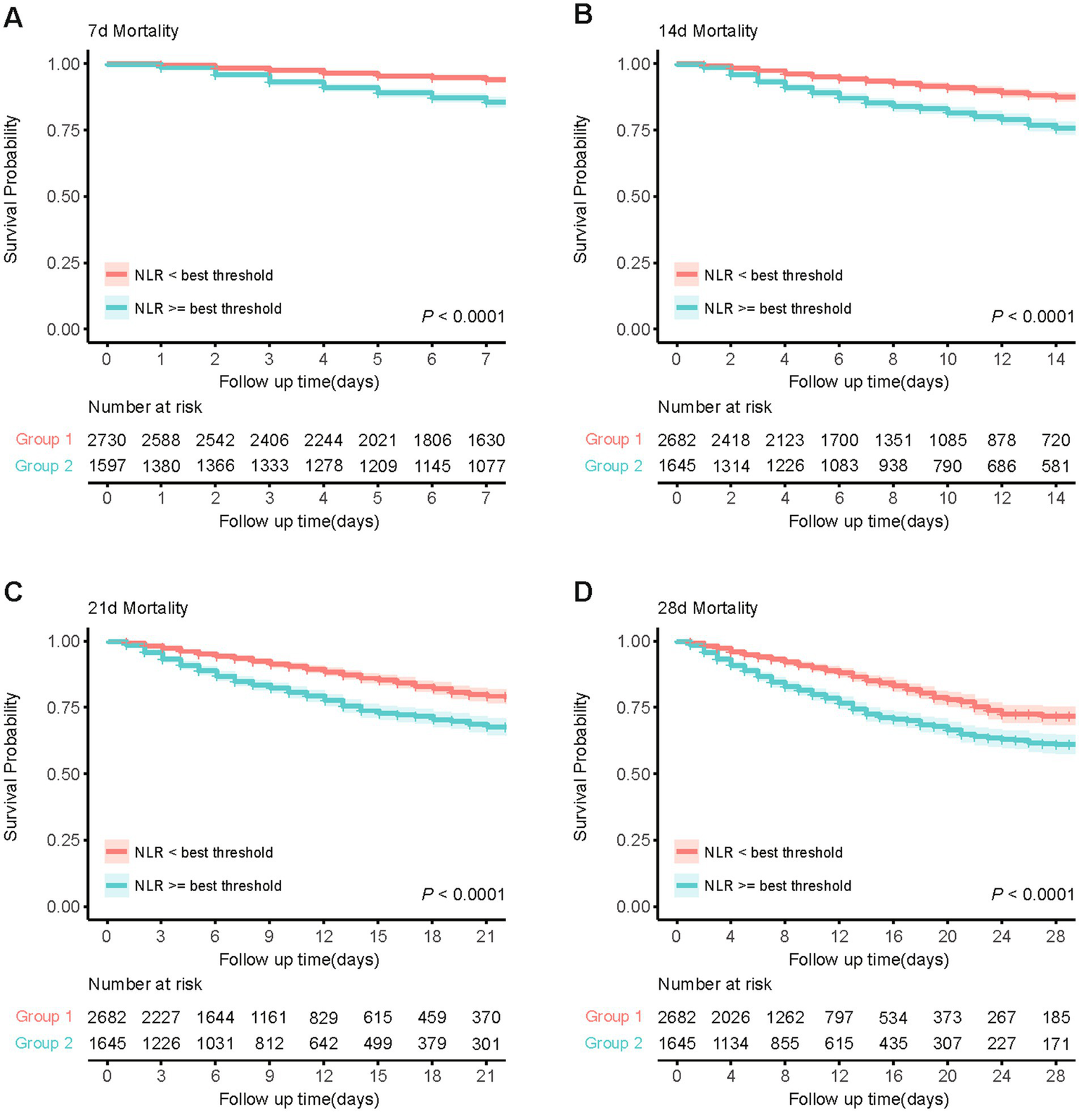 Among the 4,327 patients, 3,600 survived (survival group) and 727 died (non-survival group) within 28 days of admission (mortality rate: 16.8%). A multivariate Cox regression analysis identified NLR as an independent predictor of 28-day all-cause mortality (hazard ratio: 1.013; 95% confidence interval: 1.0086–1.0188; p < 0.001). The predictive model, incorporating NLR, age, gender, BMI, Charlson comorbidity index (CCI), WBC counts, Platelet, INR, and CRP, achieved an AUC of 0.686 (95% confidence interval: 0.665–0.70). While platelet-to-lymphocyte ratio was also analyzed, its predictive efficiency was less pronounced compared to NLR. A best NLR threshold of 6.19 was determined, distinguishing survivors from non-survivors. Kaplan–Meier survival curves showed that patients with NLR ≥ 6.19 had significantly lower survival rates at 7-, 14-, 21-, and 28-days. Subgroup analyses indicated that NLR did not significantly interact with most subgroups.