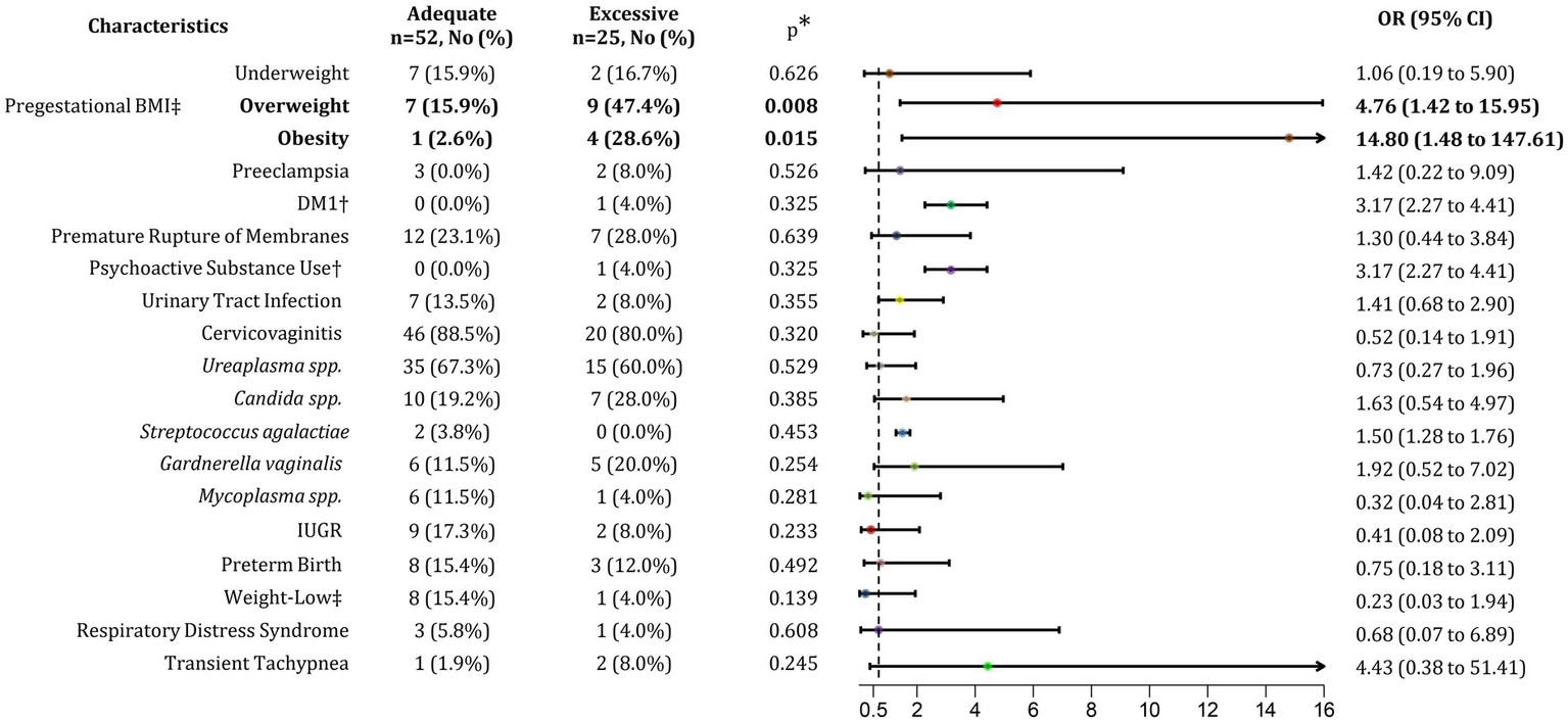 Comparing patients with adequate and excessive GWG, the distribution of underweight pregestational BMI was similar between both groups, at 15.9 and 16.7%, respectively. However, patients with an overweight pregestational BMI had an 82.6% higher risk of developing excessive GWG (p = 0.008; OR 4.76; 95% CI 1.42–15.95). Among those with pregestational obesity, the risk of excessive GWG was even greater, increasing by 93.6% (p = 0.015; OR 14.8; 95% CI 1.48–147.61) (Figure 3). These findings suggest that, although overweight prior to pregnancy is associated with achieving adequate GWG, it is also strongly linked to the development of excessive GWG.