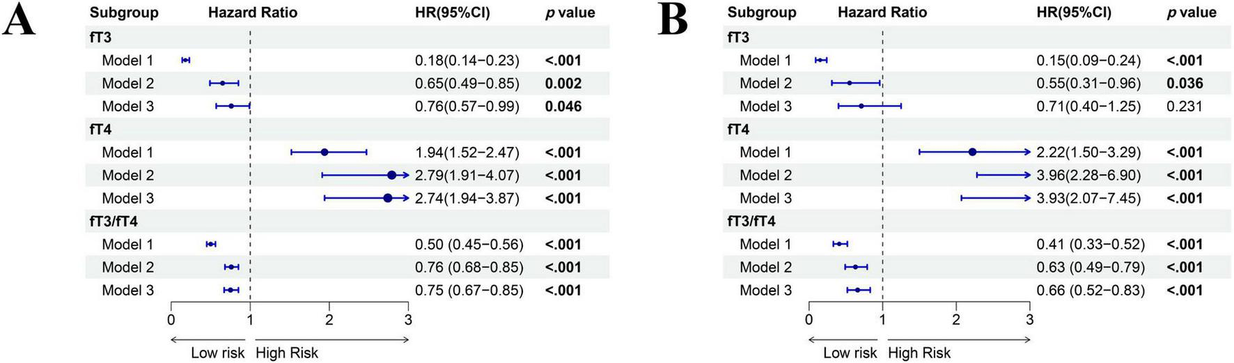 Figure 5. Associations between the levels of fT3, fT4, and fT3/fT4 ratio with mortality outcomes of adults with MetS by three Cox regression analyses models (A) The association between levels of fT3, fT4, and fT3/fT4 ratio with all-cause mortality; (B) The association between levels of fT3, fT4, and fT3/fT4 ratio with cardiovascular mortality. Results are shown for three Cox regression models: Model 1 (unadjusted), Model 2 (adjusted for age, sex, and race), and Model 3 (fully adjusted for age, sex, race, marital status, educational level, family income-poverty ratio, smoking status, alcohol use, history of cancer, chronic kidney disease, cardiovascular disease, BMI, and levels of TSH, TgAb, and TPOAb).
