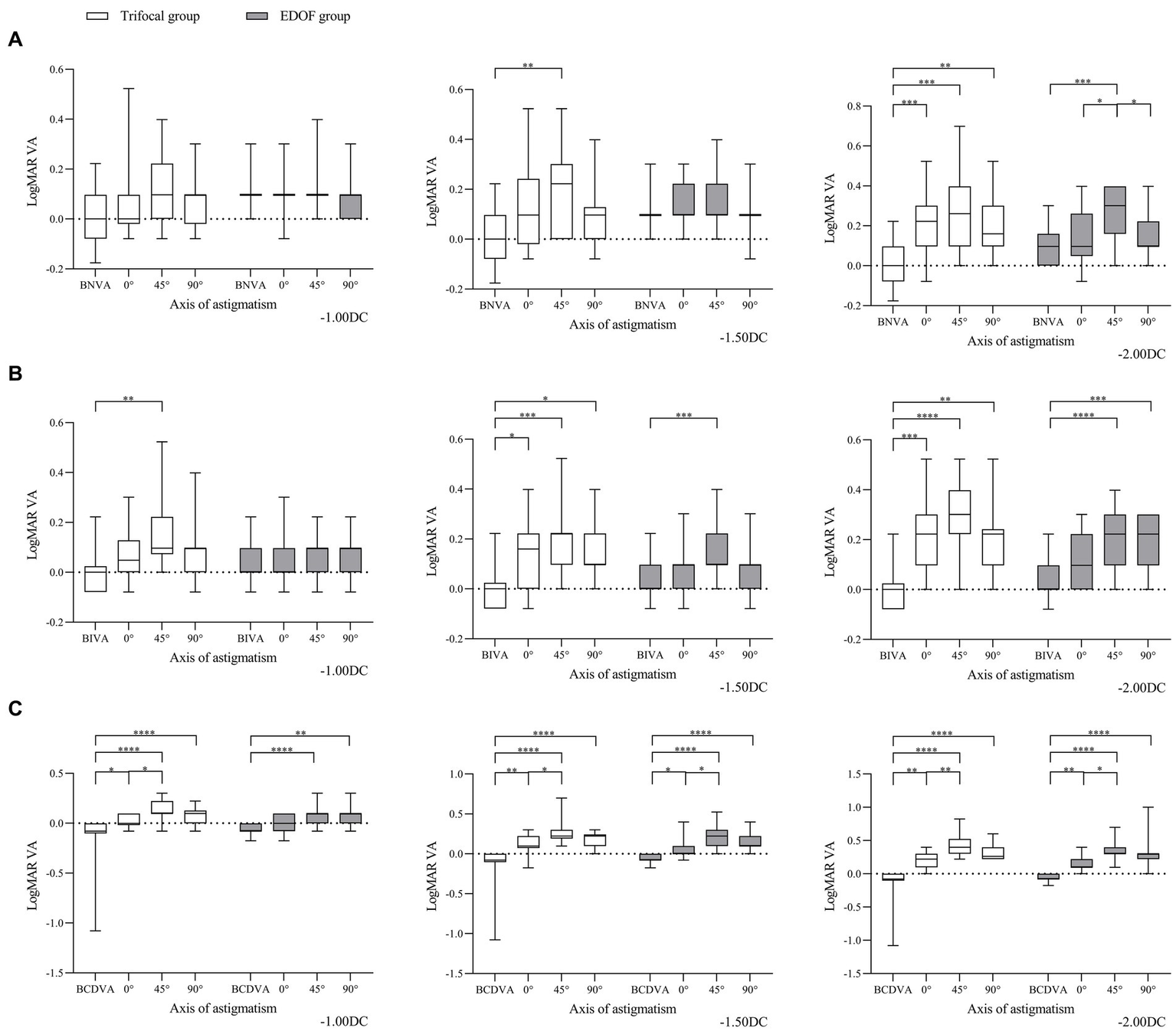 Comparison of best corrected acuity of (A) near vision, (B) intermediate vision and (C) distant vision under the specified magnitudes of induced astigmatism at different axes between individuals who received trifocal or EDOF intraocular lenses. Measurements were made after astigmatism of −1.00, −1.50 or −2.00 DC was induced at the indicated axis values at least 3 months after implantation. BCDVA, best corrected distant visual acuity; BIVA, best intermediate visual acuity; BNVA, best near visual acuity; EDOF, extended depth of focus; LogMAR VA, Logarithm of the Minimum Angle of Resolution visual acuity. *p < 0.05, **p < 0.01, ***p < 0.001, ****p < 0.0001.