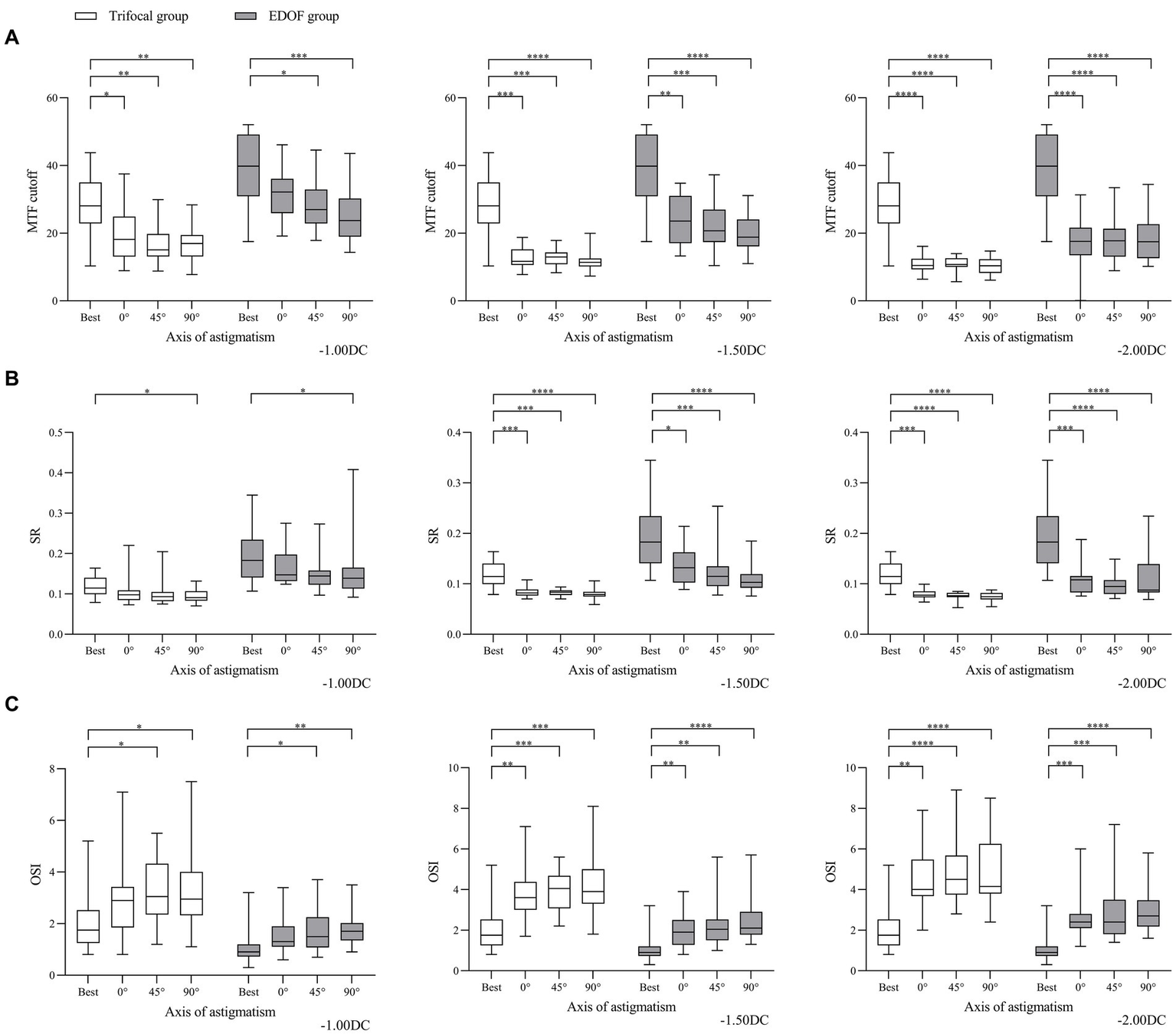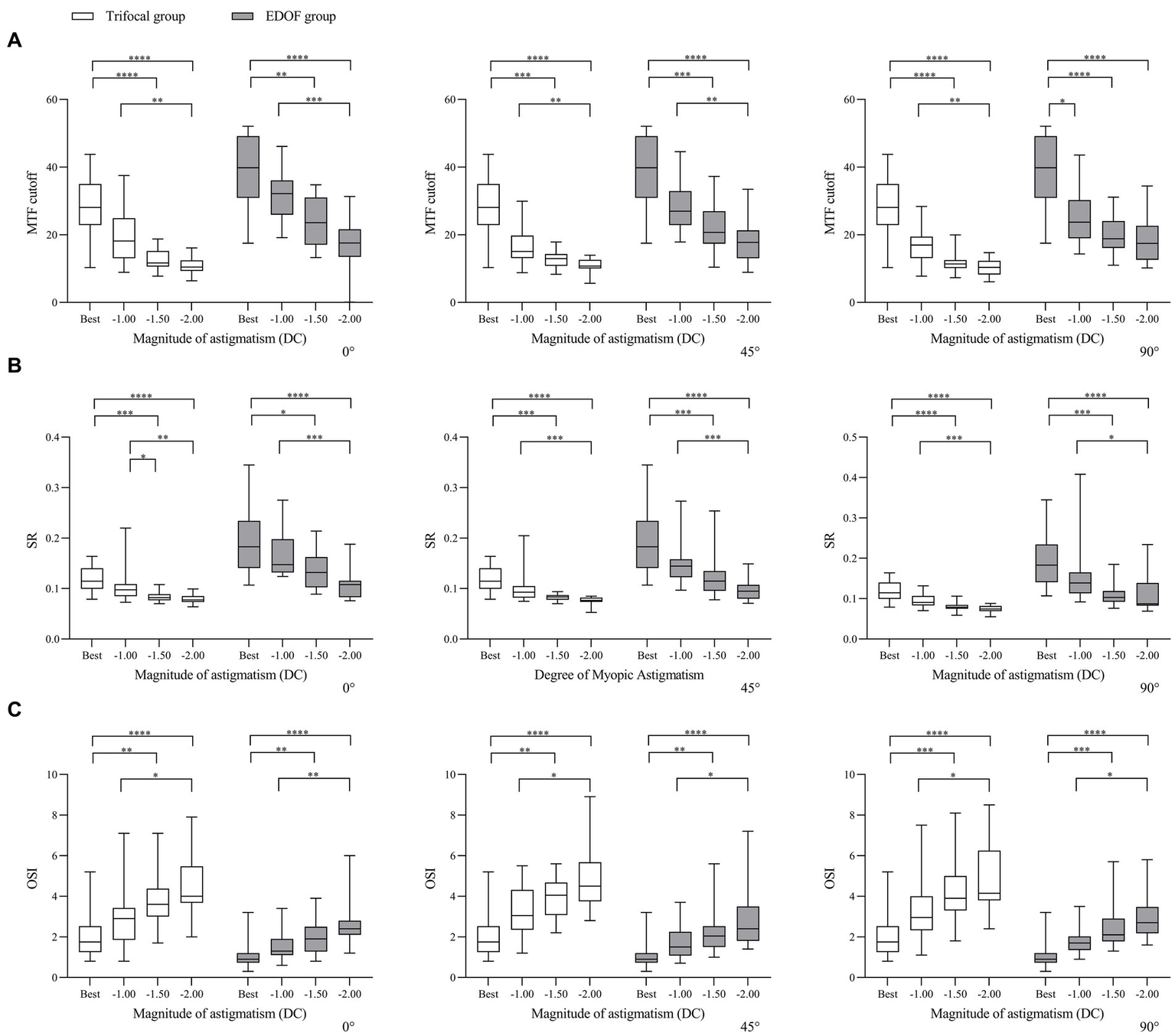 Comparison of objective visual quality under the specified magnitudes of induced astigmatism at different axes between individuals who received trifocal or EDOF intraocular lenses in terms of (A) MTF cutoff, (B) OSI and (C) SR. Measurements were made after astigmatism of −1.00, −1.50 or −2.00 DC was induced at the indicated axis values at least 3 months after implantation. EDOF, extended depth of focus; MTF, modulation transfer function; OSI, objective scatter index; SR, Strehl ratio. *p < 0.05, **p < 0.01, ***p < 0.001, ****p < 0.0001.