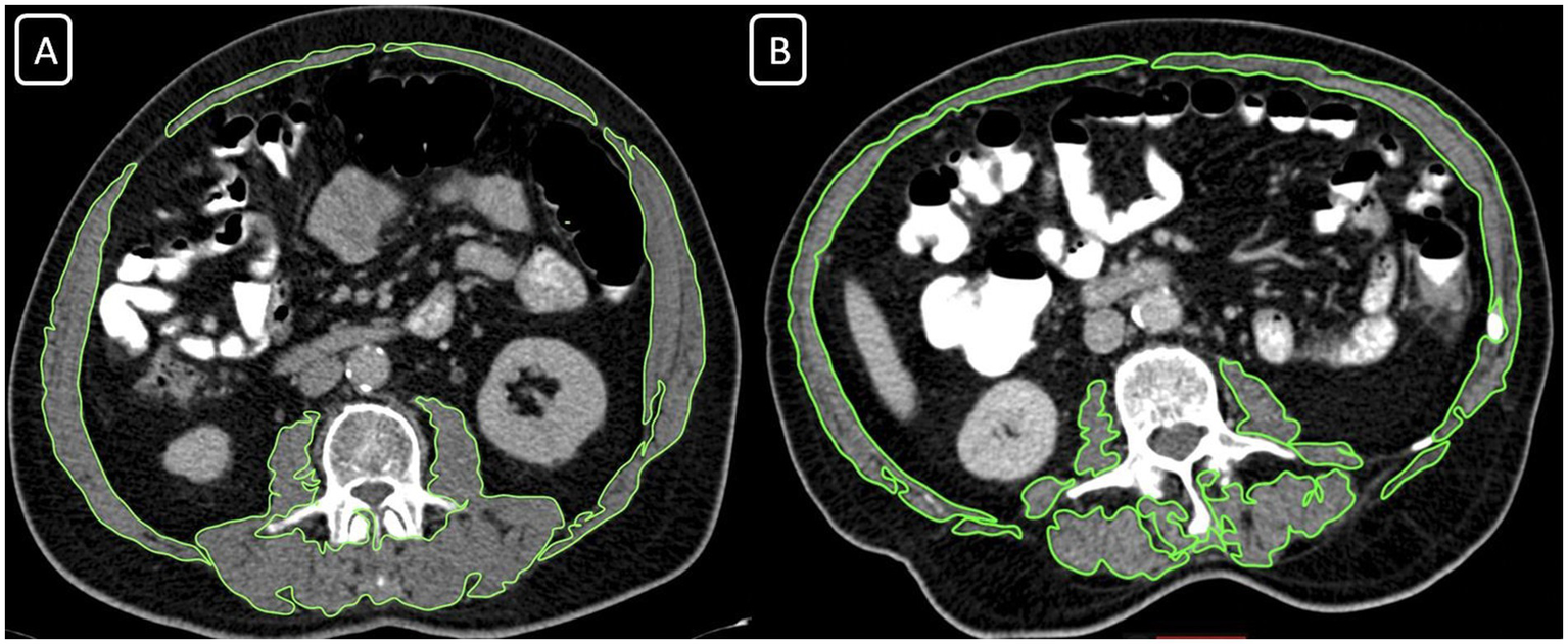 The assessment of skeletal muscle mass (SMM) was performed by contrast-enhanced thoracoabdominal computed tomography (CT) for each patient as a routine evaluation for oncological staging (Siemens Somatom Sensation 64 Detector). For determining the SMM measurements; an axial portal-phase image was obtained at the level of the third lumbar (L3) vertebra. Two radiologists evaluated the images, one with over 15 years of academic experience and the other with 10 years of experience. The images were evaluated with commercial software (Osirix Lite). The software automatically scanned the images and, according to the specific densities of the different tissues, determined the areas with a density of −29 to 150 Hounsfield Units (HU) as muscle tissues (Figure 1). The radiologists checked, revised, and approved all muscle areas that the software program calculated. Then all muscle areas were measured as cm2. Skeletal muscle mass index (SMMI) was calculated by dividing the muscle area (cm2) by the square of the patient’s height (m2). We used the classification of Martin et al. to determine the groups for SMMI (17). Low SMMI was defined in women with SMI <41 cm2/m2 and men with SMMI <43 cm2/m2 in patients with body mass index (BMI) < 25 kg/m2. Low SMMI was defined in patients with >25 kg/m2 BMI level when their SMMI was lower than 53 cm2/m2 (17). The participants were classified into two groups; patients with Low SMMI, and Normal SMMI results.