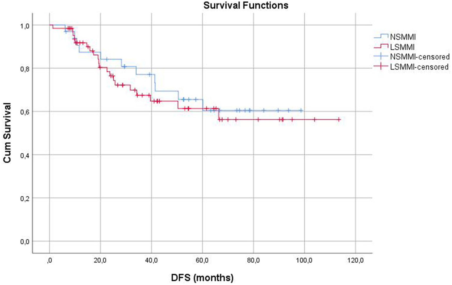 The adjuvant chemotherapy administrations were recorded in postoperative terms. Mortality rates were assessed for 30-day, 1-year, and 5-year following primary surgical intervention. The presence of recurrences of the disease was recorded. Overall survival was based on the duration from the colon resection to the death or the last follow-up. Disease-free survival was based on the duration from the colon resection to the development of local recurrence and/or distant metastasis or last follow-up. The possible effects of Low SMMI on overall survival (OS) and disease-free survival (DFS) rates were analyzed.