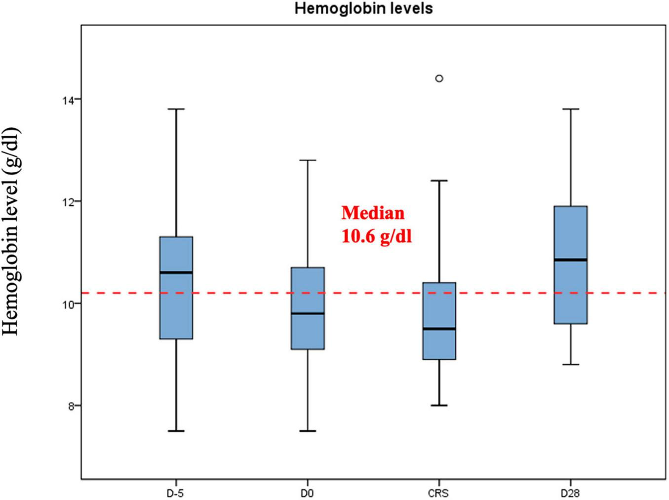 Median hemoglobin, platelet and leucocyte counts at the beginning of the lymphodepletion were 10.6 g/dl (range: 7.5–13.8 g/dl), 166 G/l (range: 39–278 G/l) and 3.9 G/l (range: 0.6–14–7 G/l), respectively. In Figures 1–3 we represent the box plots of the hemoglobin level, platelet and leukocyte counts over the study period.