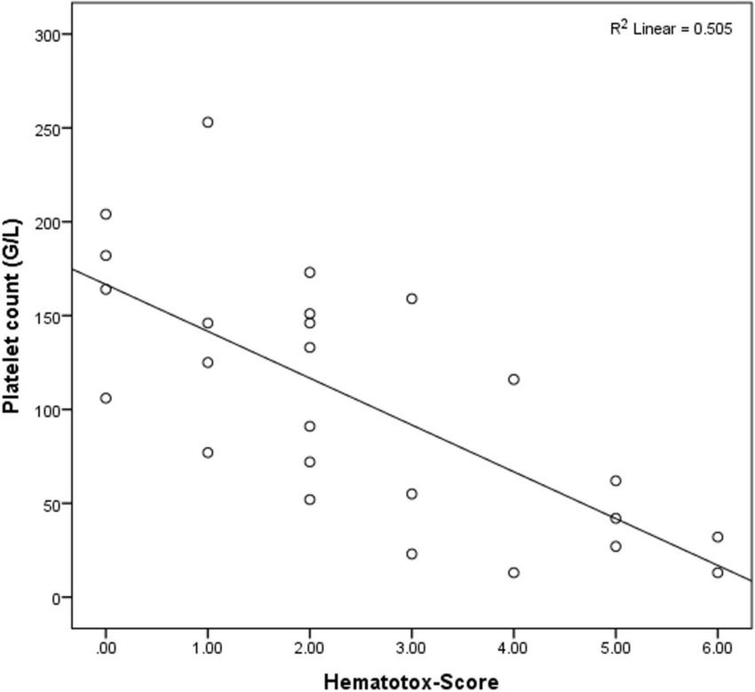 Correlation between Hematotox-Score and platelet counts at first day of CRS.